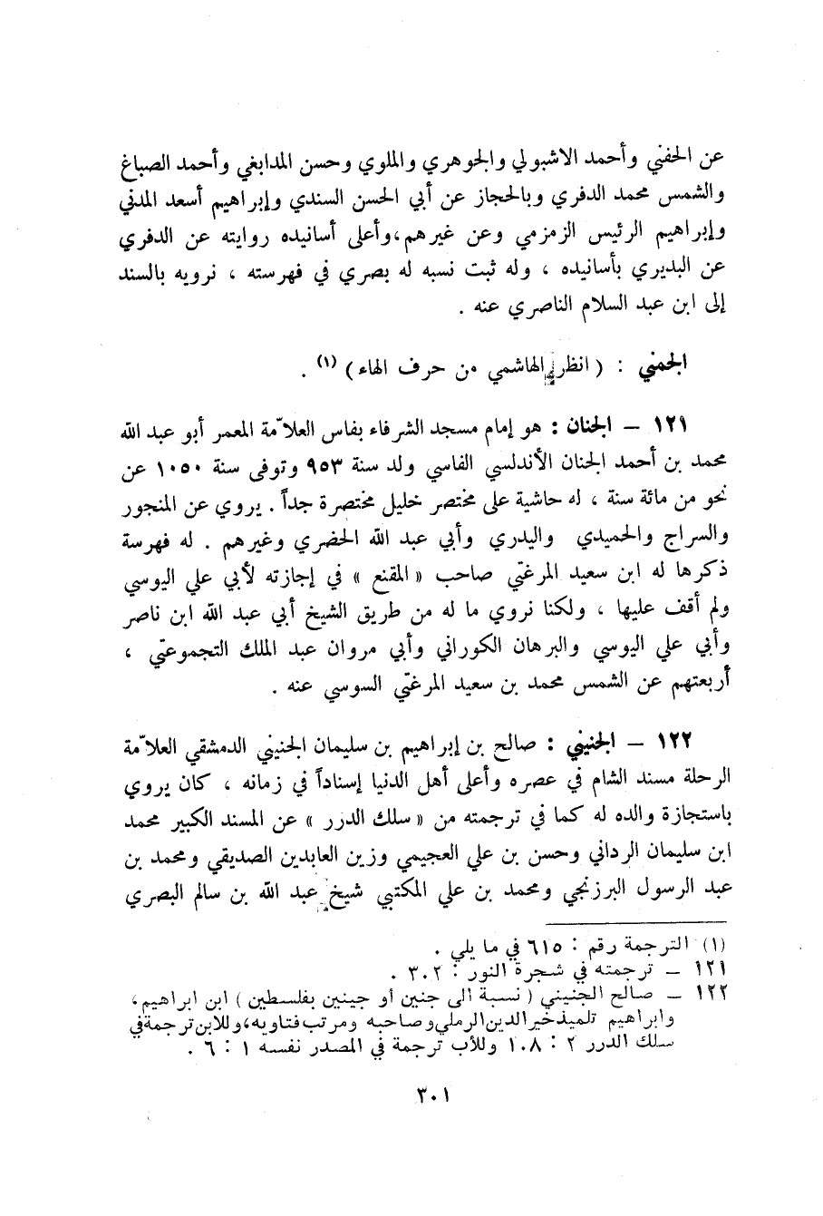 122 - الجنيني (3) : صالح بن إبراهيم بن سليمان الجنيني الدمشقي العلامة الرحلة مسند الشام في عصره وأعلى أهل الدنيا إسناداً في زمانه، كان يروي باستجازة والده له كما في ترجمته من " سلك الدرر " عن المسند الكبير محمد ابن سليمان الرداني وحسن بن عليّ العجيمي وزين العابدين الصديقي ومحمد بن عبد الرسول البرزنجي ومحمد بن عليّ المكتبي شيخ عبد الله بن سالم البصري