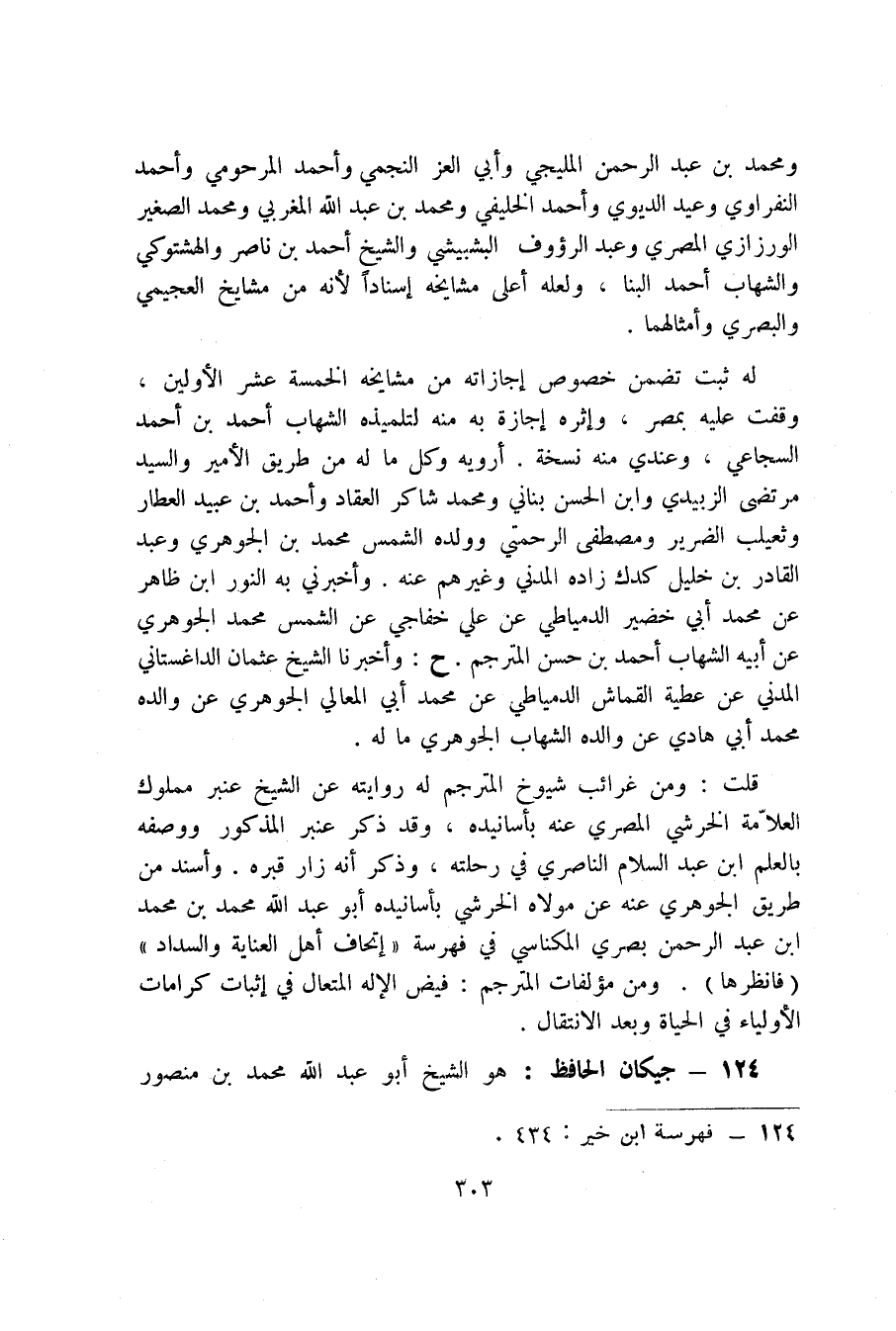قلت: ومن غرائب شيوخ المترجم له روايته عن الشيخ عنبر مملوك العلامة الخرشي المصري عنه بأسانيده، وقد ذكر عنبر المذكور ووصفه بالعلم ابن عبد السلام الناصري في رحلته، وذكر أنه زار قبره، وأسند من طريق الجوهري عنه عن مولاه الخرشي بأسانيده أبو عبد الله محمد بن محمد ابن عبد الرحمن بصري المكناسي في فهرسة " إتحاف أهل العناية والسداد " " فانظرها ". ومن مؤلفات المترجم: فيض الإله المتعال في إثبات كرامات الأولياء في الحياة وبعد الانتقال.