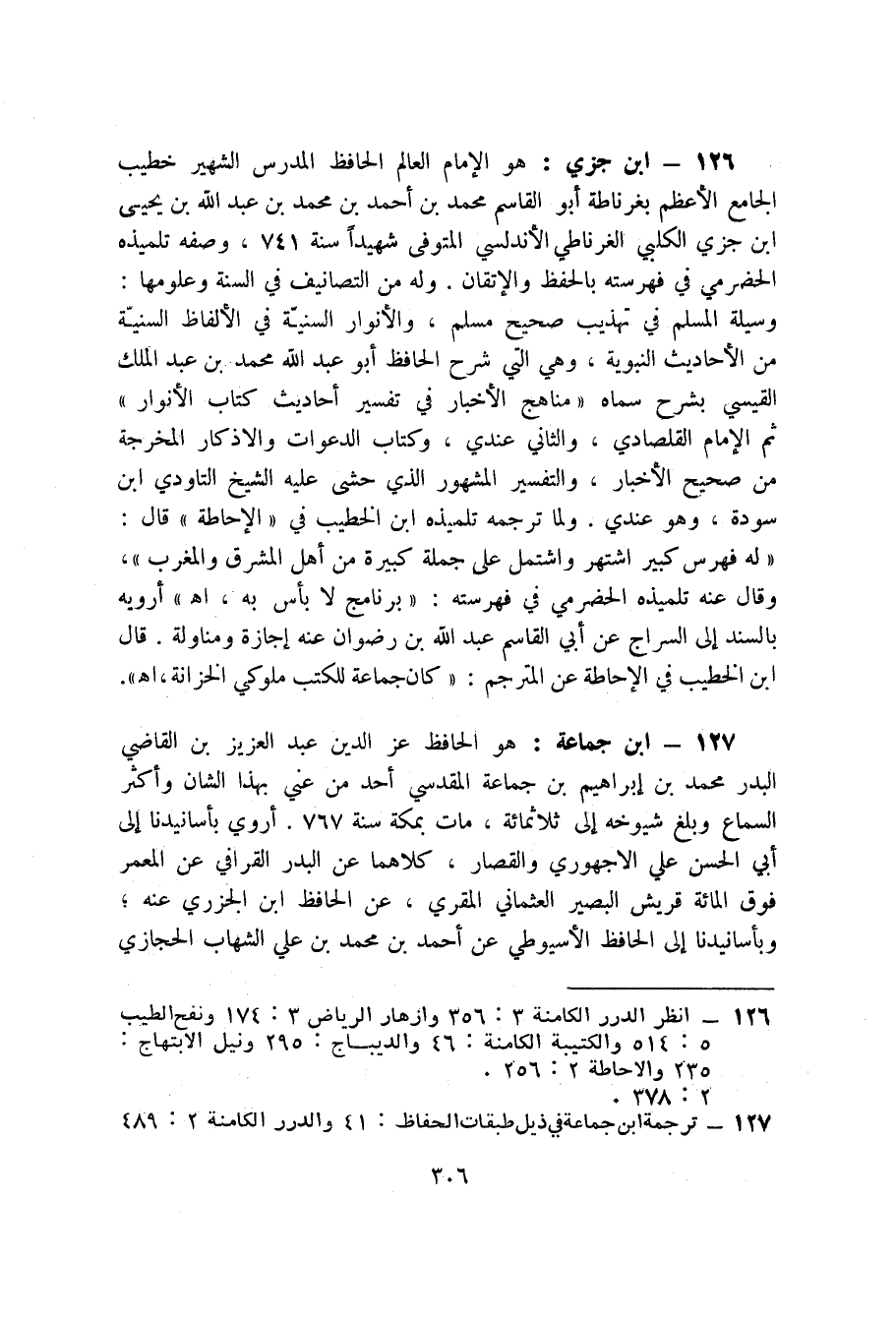 127 - ابن جماعة (2) : هو الحافظ عز الدين عبد العزيز بن القاضي البدر محمد بن إبراهيم بن جماعة المقدسي أحد من عني بهذا الشأن وأكثر السماع وبلغ شيوخه إلى ثلاثمائة، مات بمكة سنة 767. أروي بأسانيدنا إلى أبي الحسن عليّ الأجهوري والقصار، كلاهما عن البدر القرافي عن المعمر فوق المائة قريش البصير العثماني المقري، عن الحافظ ابن الجزري عنه؛ وبأسانيدنا إلى الحافظ الأسيوطي عن أحمد بن محمد بن عليّ الشهاب الحجازي