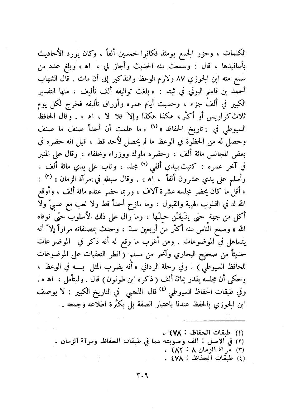 الكلمات، وحزر الجمع يومئذ فكانوا خمسين ألفاً، وكان يورد الأحاديث بأسانيدها، قال: وسمعت منه الحديث وأجاز لي، اه " وبلغ عدد من سمع منه ابن الجوزي 87 ولازم الوعظ والتذكير إلى ان مات. قال الشهاب أحمد بن قاسم البوني في ثبته: " بلغت تواليفه ألف تأليف، منها التفسير الكبير في ألف جزء، وحسبت أيام عمره وأوراق تأليفه فخرج لكل يوم ثلاث كراريس أو أكثر، هكذا هكذا وإلا فلا، اه ". وقال الحافظ السيوطي في " تاريخ الحفاظ " (1) " ما علمت أن أحداً صنف ما صنف وحصل له من الحظوة في الوعظ ما لم يحصل لأحد قط، قيل انه حضره في بعض المجالس مائة ألف، وحضره ملوك ووزراء وخلفاء، وقال على المنبر في آخر عمره: كتبت بيدي ألفي (2) مجلد، وتاب على يدي مائة ألف، وأسلم على يدي عشرون ألفاً، اه ". وقال سبطه في " مرآة الزمان " (3) : " أقل ما كان يحضر مجلسه عشرة آلاف، وربما حضر عنده مائة ألف، وأوقع الله له في القلوب الهيبة والقبول، وما مازح أحداً قط ولا لعب مع صبي ولا أكل من جهة حتى يتيقن حلها، وما زال على ذلك الأسلوب حتى توفاه الله " وسمع الناس منه أكثر من أربعين سنة، وحدث بمصنفاته مراراً إلا أنه يتساهل في الموضوعات. ومن أغرب ما وقع له أنه ذكر في الموضوعات حديثاً من صحيح البخاري وآخر من مسلم (انظر التغقبات على الموضوعات للحافظ السيوطي) . وفي رحلة الرداني " أنه يضرب المثل به في الوعظ، وحكى أن مجلسه يقدر بمائة ألف (ذكره ابن طولون) قال. وليتأمل، اه ". وفي طبقات الحفاظ للسيوطي (4) قال الذهبي في التاريخ الكبير: لا يوصف ابن الجوزي بالحفظ عندنا باعتبار الصفة بل بكثرة اطلاعه وجمعه.