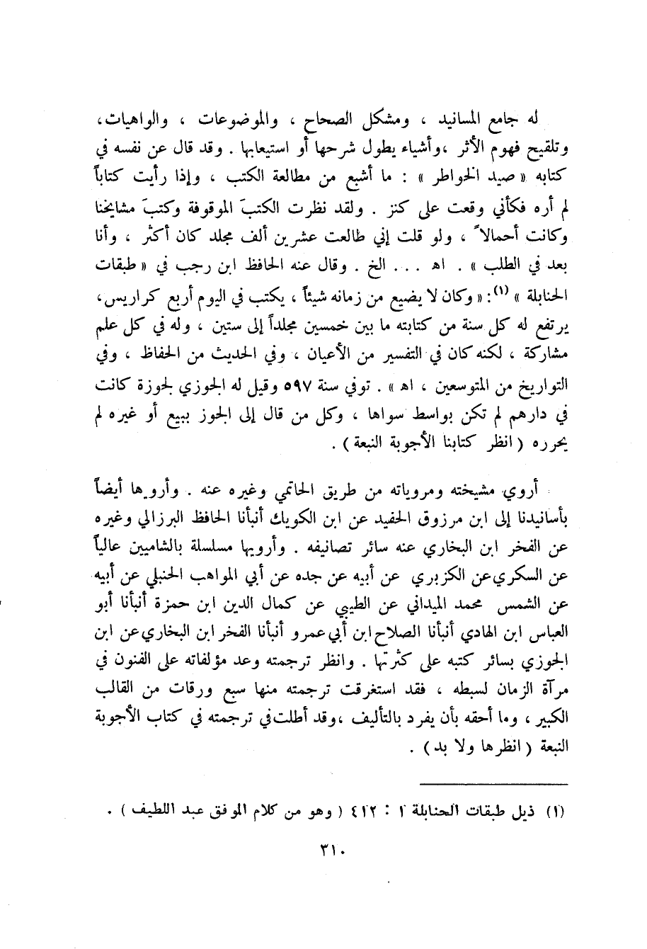 له جامع المسانيد، ومشكل الصحاح، والموضوعات، والواهبات، وتلقيح فهوم الأثر، وأشياء يطول شرحها أو استيعابها. وقد قال عن نفسه في كتابه " صيد الخواطر ": ما أشبع من مطالعة الكتب، وإذا رأيت كتاباً لم أره فكأني وقعت على كنز. ولقد نظرت الكتب الموقوفة وكتب مشايخنا وكانت أحمالاً، ولو قلت إني طالعت عشرين ألف مجلد كان أكثر، وأنا بعد في الطلب ". اه. . . الخ. وقال عنه الحافظ ابن رجب في " طبقات الحنابلة " (1) : " وكان لا يضيع من زمانه شيئاً، يكتب في اليوم أربع كراريس، يرتفع له كل سنة من كتابته ما بين خمسين مجلداً إلى ستين، وله في كل علم مشاركة، لكنه كان في التفسير من الأعيان، وفي الحديث من الحفاظ، وفي التواريخ من المتوسعين، اه ". توفي سنة 597 وقيل له الجوزي لجوزة كانت في دارهم لم تكن بواسط سواها، وكل من قال إلى الجوز ببيع أو غيره لم يحرره (انظر كتابنا الأجوبة النبعة) .