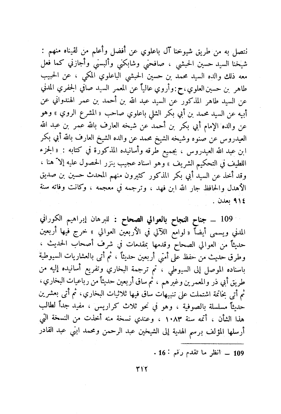 109 - جناح النجاح بالعوالي الصحاح (1) : للبرهان إبراهيم الكوراني المدني ويسمى أيضاً " لوامع اللآلي في الأربعين العوالي " خرج فيها أربعين حديثاً من العوالي الصحاح وقدمها بمقدمات في شرف أصحاب الحديث، وطرق حديث من حفظ على أمتي أربعسين حديثاً، ثم أتى بالعشاريات السيوطية باسناده الموصل إلى السيوطي، ثم ترجمة البخاري وتفريع أسانيده إليه من طريق أبي ذر والمعمرين وغيرهم، ثم ساق أربعين حديثاً من رباعيات البخاري، ثم أتى بخاتمة اشتملت على تنبيهات ساق فيها ثلاثيات البخاري، ثم أتى بعشرين حديثاً مسلسلة بالصوفية، وهو في نحو ثلاث كراريس، مفيد جداً لطالب هذا الشأن، أتمه سنة 1083، وعندي نسخة منه أخذت من النسخة التي أرسلها المؤلف برسم الهدية إلى الشيخين عبد الرحمن ومحمد ابني عبد القادر