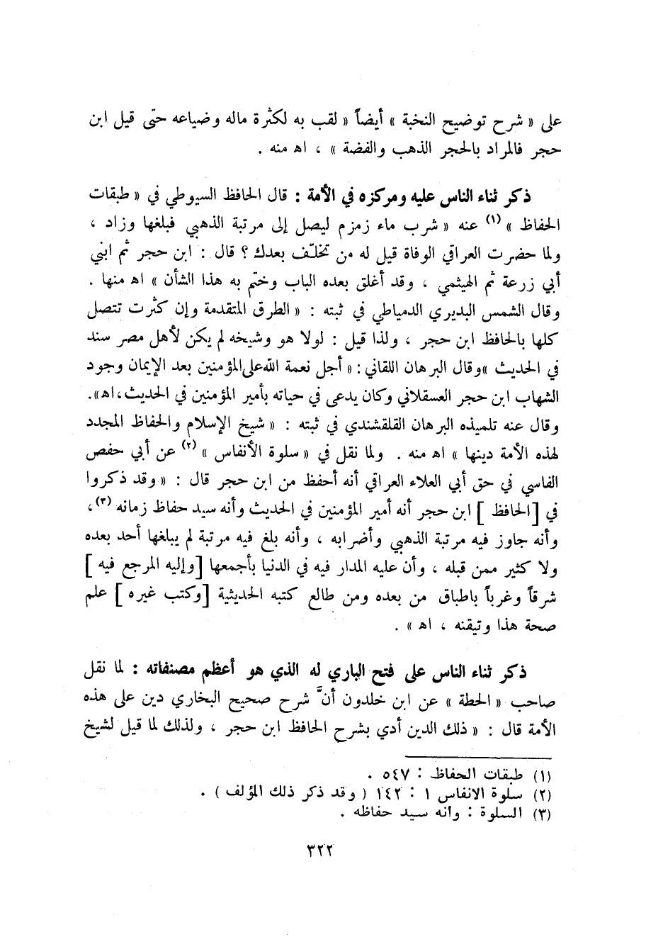 ذكر ثناء الناس عليه ومركزه في الأمة: قال الحافظ السيوطي في " طبقات الحفاظ " (1) عنه " شرب ماء زمزم ليصل إلى مرتبة الذهبي فبلغها وزاد، ولما حضرت العراقي الوفاة قيل له من تخلف بعدك قال: ابن حجر ثم ابني أبي زرعة ثم الهيثمي، وقد أغلق بعده الباب وختم به هذا الشأن " اه منها. وقال الشمس البديري الدمياطي في ثبته: " الطرق المتقدمة وإن كثرت تتصل كلها بالحافظ ابن حجر، ولذا قيل: لولا هو وشيخه لم يكن لأهل مصر سند في الحديث " وقال البرهان اللقاني: " أجل نعمة الله على المؤمنين بعد الإيمان وجود الشهاب ابن حجر العسقلاني وكان يدعى في حياته بأمير المؤمنين في الحديث، اه ". وقال عنه تلميذه البرهان القلقشندي في ثبته: " شيخ الإسلام والحفاظ المجدد لهذه الأمة دينها " اه منه. ولما نقل في " سلوة الأنفاس " (2) عن أبي حفص الفاسي في حق أبي العلاء العراقي أنه أحفظ من ابن حجر قال: " وقد ذكروا في [الحافظ] ابن حجر أنه أمير المؤمنين في الحديث وأنه سيد حفاظ زمانه (3) ، وأنه جاوز في مرتبة الذهبي وأضرابه، وأنه بلغ فيه مرتبة لم يبلغها أحد بعده ولا كثير ممن قبله، وأن عليه المدار فيه في الدنيا بأجمعها [وإليه المرجع فيه] شرقاً وغرباً باطباق من بعده ومن طالع كتبه الحديثية [وكتب غيره] علم صحة هذا وتيقنه، اه ".
