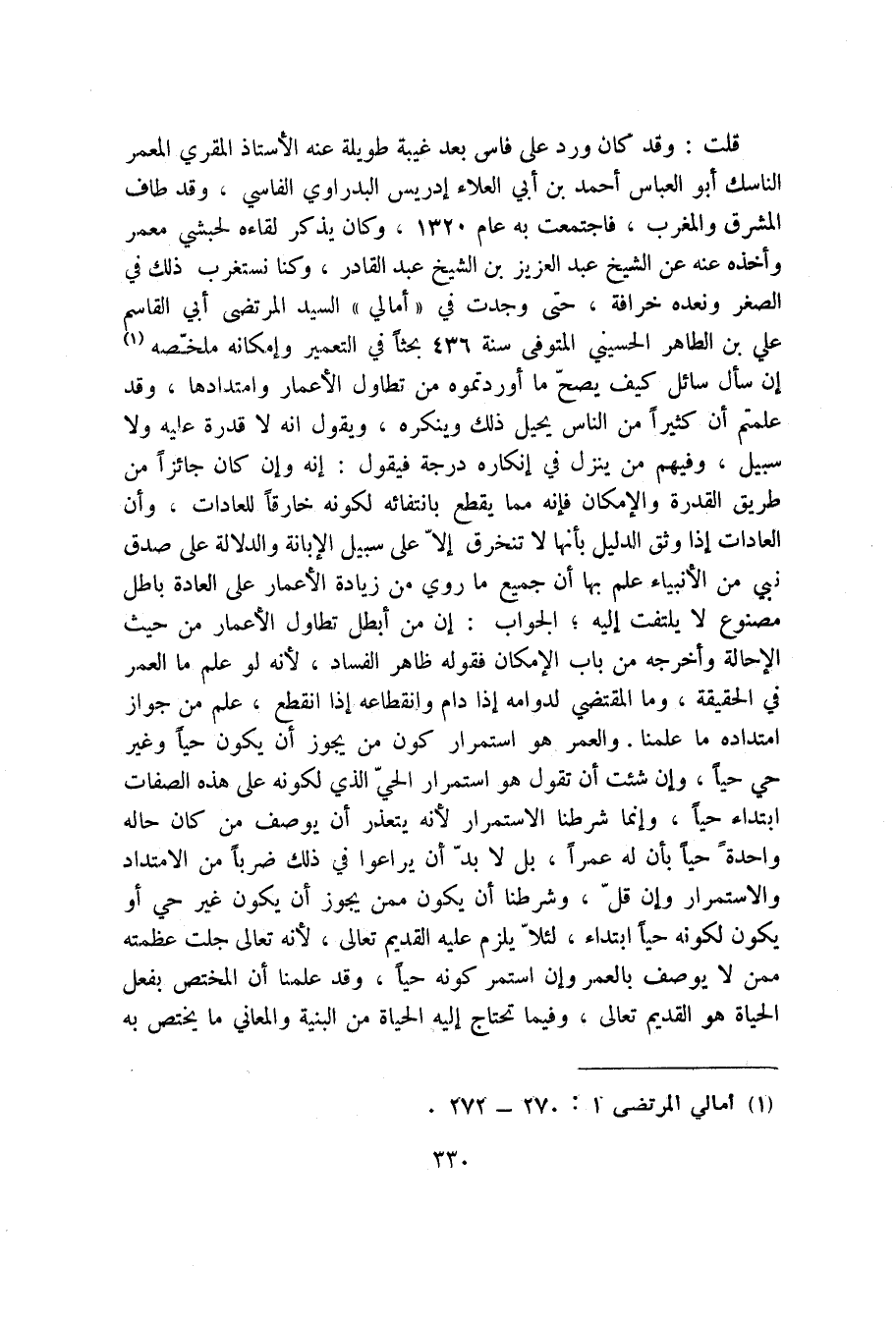 قلت: وقد كان ورد على فاس بعد غيبة طويلة عنه الأستاذ المقري المعمر الناسك أبو العباس أحمد بن أبي العلاء إدريس البدراوي الفاسي، وقد طاف المشرق والمغرب، فاجتمعت به عام1320، وكان يذكر لقاءه لحبشي معمر وأخذه عنه عن الشيخ عبد العزيز بن الشيخ عبد القادر، وكنا نستغرب ذلك في الصغر ونعتبره خرافة، حتى وجدت في " أمالي " السيد المرتضى أبي القاسم عليّ بن الطاهر الحسيني المتوفى سنة 436 بحثاً في التعمير وإمكانه ملخصة (1) إن سأل سائل كيف يصح ما أوردتموه من تطاول الأعمار وامتدادها، وقد علمتم أن كثيراً من الناس يحيل ذلك وينكره، ويقول انه لا قدرة عليه ولا سبيل، وفيهم من ينزل في إنكاره درجة فيقول: إنه وإن كان جائزاً من طريق القدرة والإمكان فإنه مما يقطع بانتفائه لكونه خارقاً للعادات، وأن العادات إذا وثق الدليل بأنها لا تنخرق إلا على سبيل الإبانة والدلالة على صدق نبي من الأنبياء علم بها أن جميع ما روي من زيادة الأعمار على العادة باطل مصنوع لا يلتفت إليه؛ الجواب: إن من أبطل تطاول الأعمار من حيث الإحالة وأخرجه من باب الإمكان فقوله ظاهر الفساد، لأنه لو علم ما العمر في الحقيقة، وما المقتضي لدوامه إذا دام وانقطاعه إذا انقطع، علم من جواز امتداده ما علمنا. والعمر هو استمرار كون من يجوز أن يكون حياً وغير حي حياً، وإن شئت أن تقول هو استمرار الحي الذي لكونه على هذه الصفات ابتداء حياً، وإنما شرطنا الاستمرار لأنه يتعذر أن يوصف من كان حاله واحدة حياً بأن له عمراً، بل لا بد أن يراعوا في ذلك ضرباً من الامتداد والاستمرار وإن قل، وشرطنا أن يكون ممن يجوز أن يكون غير حي أو يكون لكونه حياً ابتداء، لئلا يلزم عليه القديم تعالى، لأنه تعالى جلت عظمته ممن لا يوصف بالعمر وإن استمر كونه حياً، وقد علمنا أن المختص بفعل الحياة هو القديم تعالى، وفيما تحتاج إليه الحياة من البنية والمعاني ما يختص به