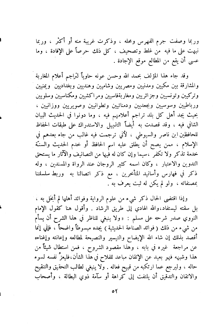وقد جاء المؤلف بحمد الله وحسن عونه حاويا لتراجم أعلام المغاربة والمشارقة بين مكيين ومدنيين ومصريين وشاميين وهنديين وبغداديين ويمنيين وتركيين وتونسيين وجزائريين ومغاربة فاسيين ومراكشيين ومكناسيين وسلويين ورباطيين وسوسيين وبجعديين ودمناتيين وتطوانيين وصويريين ووزانيين، بحيث يجد أهل كل بلد تراجم أعلامهم فيه، وما دونوا في الحديث البيان الشافي فيه، وقد قصدت به أيضاً التذييل والاستدراك على طبقات الحفاظ للحافظين ابن ناصر والسيوطي، لأني ترجمت فيه غالب من جاء بعدهم في الإسلام، ممن يصح أن يطلق عليه اسم الحافظ أو خدم الحديث والسنة خدمة تذكر ولا تكفر، سيما وإن كان له فيها من التصانيف والآثار ما يستحق التدوين والاعتبار، وكان اسمه كثير الروجان عند الرواة والمسندين، وله ذكر في فهارس وأسانيد المتأخرين، مع ذكر اتصالنا به وربط سلسلتنا بمصنفاته، ولو لم يكن له ثبت يعرف به.