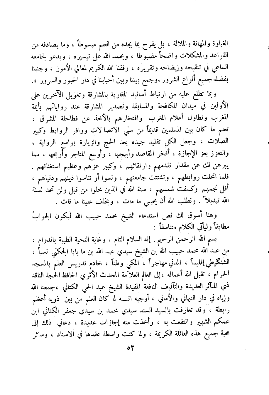بسم الله الرحمن الرحيم. إنه السلام التام، وغاية التحية الطيبة بالدوام، من عبد الله محمد حبيب الله بن الشيخ سيدي عبد الله بن مايابا الجكني نسبا، الشنكيطي إقليما، المدني مهاجرا، المكي وطنا، خادم تدريس العلم بالمسجد الحرام، تقبل الله أعماله، إلى العالم العلامة المحدث الأثري الحافظ الحجة الناقد ذي المآثر العديدة والتآليف النافعة المفيدة الشيخ عبد الحي الكتاني، جمعنا الله وإياه في دار التهاني والأماني، أوجبه انه لما كان العلم من بين ذويه أعظم رابطة، وقد تعارفت بالسيد السند سيدي محمد بن سيدي جعفر الكتاني ابن عمكم الشهير وانتفعت به، وأخذت منه إجازات عديدة، دعاني ذلك إلى محبة جميع هذه العائلة الكريمة، ولما كنت واسطة عقدها في الإسناد، وسائر
