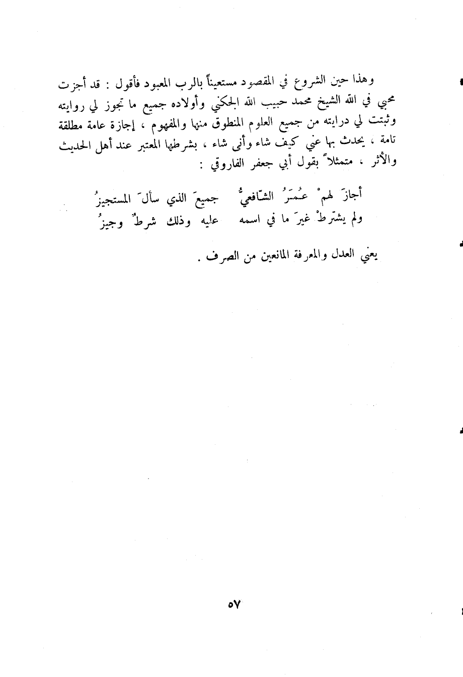 وهذا حين الشروع في المقصود مستعينا بالرب المعبود فأقول: قد أجزت محبي في الله الشيخ محمد حبيب الله الجكني وأولاده جميع ما تجوز لي روايته وثبتت لي درايته من جميع العلوم المنطوق منها والمفهوم، إجازة عامة مطلقة تامة، يحدث بها عني كيف شاء، بشرطها المعتبر عند أهل الحديث والآثر، متمثلا بقول أبي جعفر الفاروقي:
