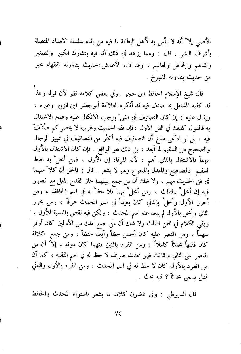 قال شيخ الإسلام الحافظ ابن حجر: وفي بعض كلامه نظر لأن قوله وهذا قد كفيه المشتغل بما صنف فيه قد أنكره العلامة أبو جعفر ابن الزبير وغيره، ويقال عليه: إن كان التصنيف في الفن يوجب الاتكال عليه وعدم الاشتغال به فالقول كذلك في الفن الأول، فإن فقه الحديث وغريبه لا يحصر كم صنف فيه، بل لو ادعى مدع أن التصانيف فيه أكثر من التصانيف في تمييز الرجال والصحيح من السقيم لما أبعد، بل ذلك هو الواقع. فإن كان الاشتغال بالأول مهما فالاشتغال بالثاني أهم، لأنه المرقاة إلى الأول، فمن أخل به خلط السقيم بالصحيح والمعدل بالمجرح وهو لا يشعر. قال: فالحق أن كلا منهما في فن الحديث مهم، ولاشك أن من جمع بينهما حاز القدح المعلى مع قصور فيه إن أخل بالثالث، ومن أخل بهما فلا حظ له في اسم الحافظ، ومن أحرز الأول وأخل بالثاني كان بعيدا في اسم المحدث عرفا، ومن يحرز الثاني وأخل بالأول لم يبعد عنه اسم المحدث، ولكن فيه نقص بالنسبة للأول، وبقي الكلام في الفن الثالث ولاشك أن من جمع ذلك من الأولين كان أوفر سهما، ومن اقتصر عليه كان أحسن حظا وأبعد حفظا، ومن جمع الثلاثة كان فقيها محدثا كاملا، ومن انفرد باثنين منهما كان دونه، إلا أن من اقتصر على الثاني والثالث فهو محدث صرف لاحظ له في اسم المحدث، ومن أنفرد بالأول والثاني فهل يسمى محدثا فيه بحث.