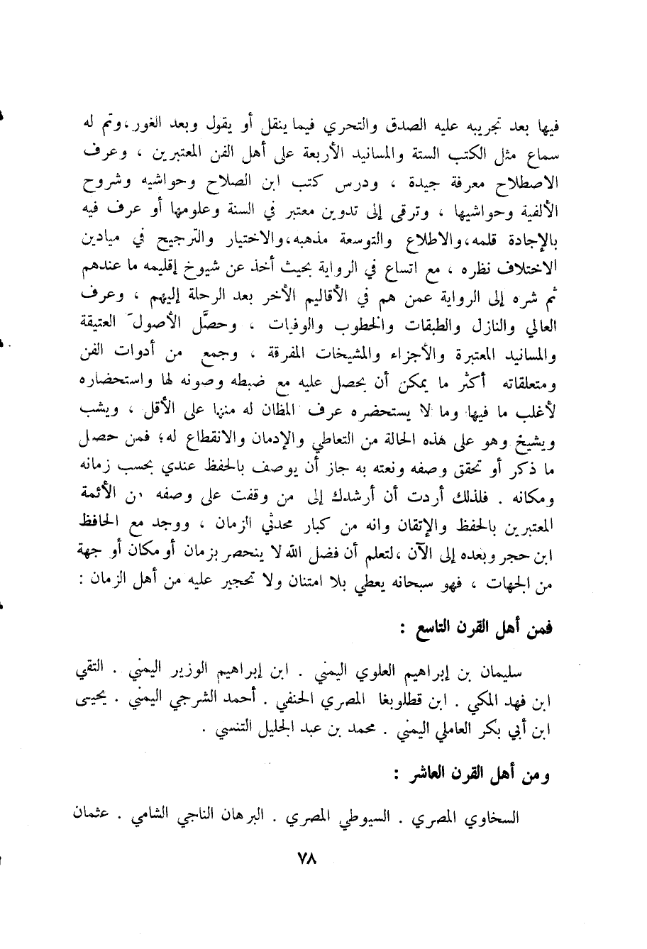 فيها بعد تجريبه عليه الصدق والتحري فيما ينقل أو يقول وبعد الغور، وتم له سماع مثل الكتب الستة والمسانيد الأربعة على أهل الفن المعتبرين، وعرف الاصطلاح معرفة جيدة، ودرس كتب ابن الصلاح وحواشيه وشروح الألفية وحواشيها، وترقى إلى تدوين معتبر في السنة وعلومها أو عرف فيه بالإجادة قلمه، والاطلاع والتوسعة مذهبه، والاختيار والترجيح في ميادين الاختلاف نظره، مع اتساع في الرواية بحيث أخذ عن شيوخ إقليمه ما عندهم ثم شره إلى الرواية عمن هم في الأقاليم الأخر بعد الرحلة إليهم، وعرف العالي والنازل والطبقات والخطوب والوفيات، وحصل الأصول العتيقة والمسانيد المعتبرة والأجزاء والمشيخات المفرقة. وجمع من أدوات الفن ومتعلقاته أكثر ما يمكن أن يحصل عليه مع ضبطه وصونه لها واستحضاره لأغلب ما فيها وما لا يستحضره عرف المظان له منها على الأقل، ويشب ويشيخ وهو على هذه الحالة من التعاطي والإدمان والانقطاع له؛ فمن حصل ما ذكر أو تحقق وصفه ونعته به جاز أن يوصف بالحفظ عندي بحسب زمانه ومكانه. فلذلك أردت أن أرشدك إلى من وقفت على وصفه من الأئمة المعتبرين بالحفظ والإتقان وانه من كبار محدثي الزمان، ووجد مع الحافظ ابن حجر وبعده إلى الآن، لتعلم أن فضل الله لا ينحصر بزمان أو مكان أو جهة من الجهات، فهو سبحانه يعطي بلا امتنان ولا تحجير عليه من أهل الزمان: