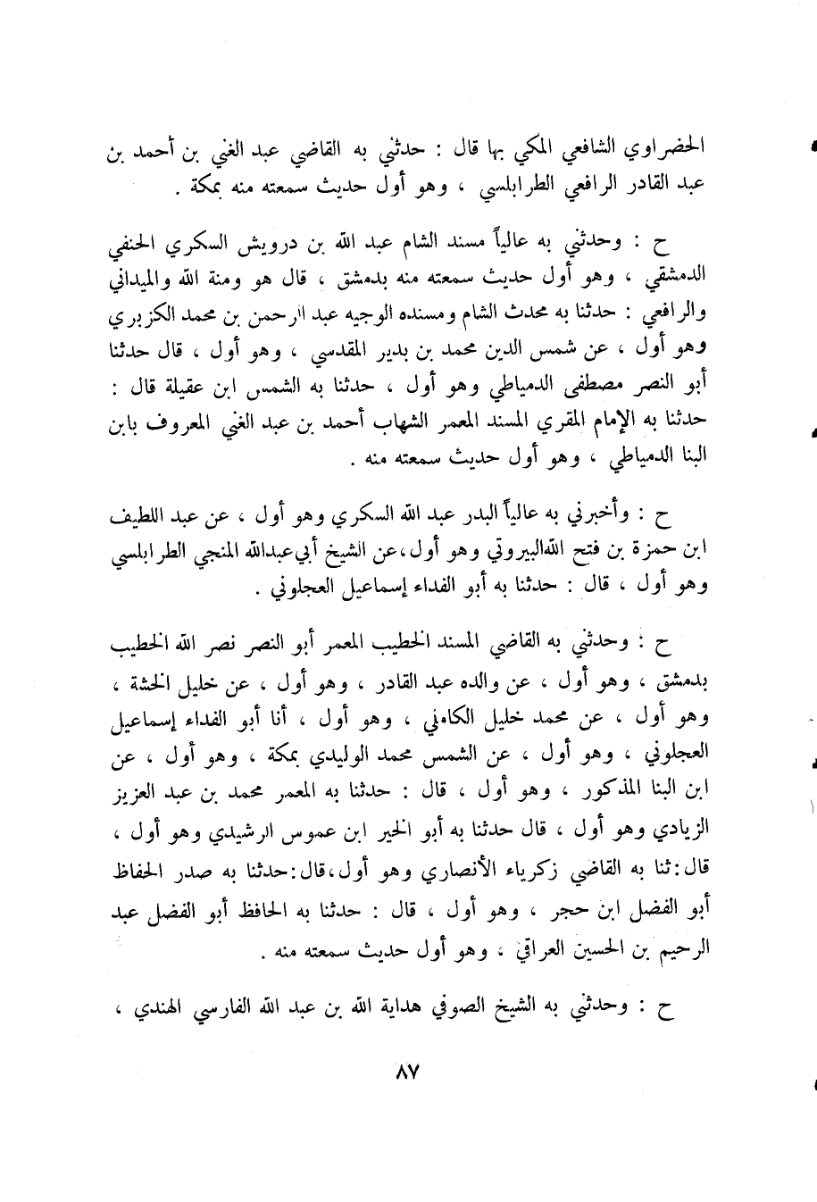 ح: وأخبرني به عاليا البدر عبد الله السكري وهو أول، عن عبد اللطيف ابن حمزة بن فتح الله البيروتي وهو أول، عن الشيخ أبي عبد الله المنجي الطرابلسي وهو أول، قال: حدثنا به أبو الفداء إسماعيل العجلوني.