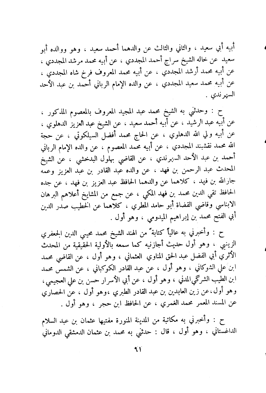 ح: وحدثني به الشيخ محمد عبد المجيد المعروف بالمعصوم المذكور، عن أبيه عبد الرشيد، عن أبيه أحمد سعيد، عن الشيخ عبد العزيز الدهلوي، عن أبيه ولي الله الدهلوي، عن الحاج محمد أفضل السليكوتي، عن حجة الله محمد نقشبند المجددي، عن أبيه محمد المعصوم، عن والده الإمام الرباني أحمد بن عبد الأحد السهرندي، عن القاضي بهلول البدخشي، عن الشيخ المحدث عبد الرحمن بن فهد، عن والده عبد القادر بن عبد العزيز وعمه جار الله بن فهد، كلاهما عن والدهما الحافظ عبد العزيز بن فهد، عن جده الحافظ تقي الدين محمد بن فهد المكي، عن جمع من المشايخ أعلاهم البرهان الابناسي وقاضي القضاة أبو حامد المطري، كلاهما عن الخطيب صدر الدين أبي الفتح محمد بن إبراهيم الميدومي، وهو أول.
