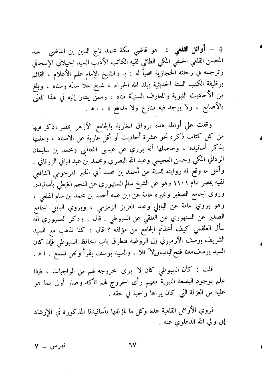 4 - أوائل القلعي: هو قاضي مكة محمد تاج الدين بن القاضي عبد المحسن القلعي الحنفي المكي الطائي لقيه الكاتب الأديب السيد الجيلاني الإسحاق وترجمه في رحلته الحجازية محليا له: ب " الشيخ الإمام علم الأعلام، القائم بوظيفة الكتب الستة الحديثية ببلد الله الحرام، شيخ علا سنه وسناه، وبلغ من الأحاديث النبوية والمعارف السنية مناه، وممن يشار إليه في هذا المعنى بالأصابع، ولا يوجد فيه منازع ولا مدافع ". اه.