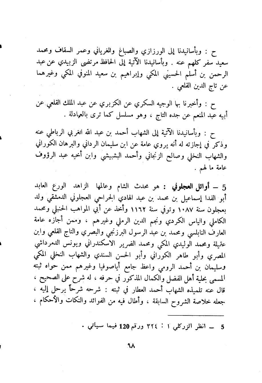5 - أوائل العجلوني (1) : هو محدث الشام وعالمها الزاهد الورع العابد أبو الفدا إسماعيل بن محمد بن عبد الهادي الجراحي العجلوني الدمشقي ولد بعجلون سنة 1.87 وتوفي سنة 1162 وأخذ عن أبي المواهب الحنبلي ومحمد الكاملي والياس الكردي ونجم الدين الرملي وغيرهم، وممن أجازه عامة العارف النابلسي ومحمد بن عبد الرسول البرزنجي والبصري والتاج القلعي وابن عقيلة ومحمد الوليدي المكي ومحمد الضرير الاسكندراني ويونس الدمرداشي المصري وأبو طاهر الكوراني وأبو الحسن السندي والشهاب النخلي المكي وسليمان بن أحمد الرومي واعظ جامع أياصوفيا وغيرهم ممن حواه ثبته المسمى بحلية أهل الفضل والكمال المذكور في حرفه، له شرح على الصحيح، قال عنه تلميذه الشهاب أحمد العطار في ثبته: شرحه شرحا يرحل إليه، جعله خلاصة الشروح السابقة، وأطال فيه من الفوائد والنكات والأحكام، سماه الفيض الجاري، وصل فيه إلى كتاب التفسير واختر منه المنية قبل كماله، اه.