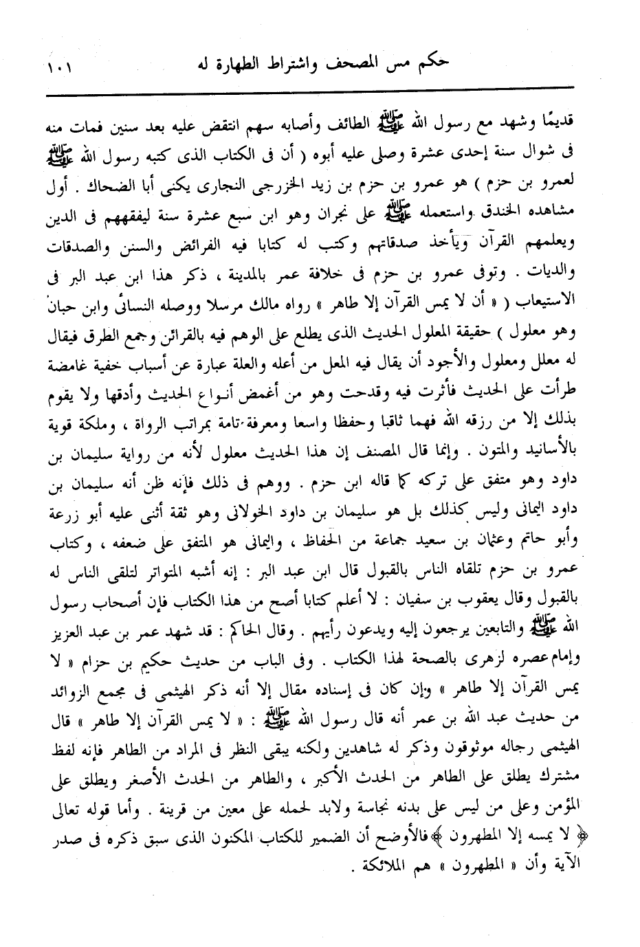 وَفِي الْبَابِ مِنْ حَدِيثِ حَكِيمِ بْنِ حِزَامٍ «لَا يَمَسُّ الْقُرْآنَ إلَّا طَاهِرٌ» وَإِنْ كَانَ فِي إسْنَادِهِ مَقَالٌ، إلَّا أَنَّهُ ذَكَرَهُ الْهَيْثَمِيُّ فِي مَجْمَعِ الزَّوَائِدِ مِنْ حَدِيثِ عَبْدِ اللَّهِ بْنِ عُمَرَ "، أَنَّهُ قَالَ: قَالَ رَسُولُ اللَّهِ - صَلَّى اللَّهُ عَلَيْهِ وَسَلَّمَ -: «لَا يَمَسُّ الْقُرْآنَ إلَّا طَاهِرٌ» قَالَ الْهَيْثَمِيُّ رِجَالُهُ مُوَثَّقُونَ، وَذَكَرَ لَهُ شَاهِدَيْنِ، وَلَكِنَّهُ يَبْقَى النَّظَرُ فِي الْمُرَادِ مِنْ الطَّاهِرِ، فَإِنَّهُ لَفْظٌ مُشْتَرَكٌ يُطْلَقُ عَلَى الطَّاهِرِ مِنْ الْحَدَثِ الْأَكْبَرِ وَالطَّاهِرِ مِنْ الْحَدَثِ الْأَصْغَرِ، وَيُطْلَقُ عَلَى الْمُؤْمِنِ، وَعَلَى مَنْ لَيْسَ عَلَى بَدَنِهِ نَجَاسَةٌ، وَلَا بُدَّ لِحَمْلِهِ عَلَى مُعَيَّنٍ مِنْ قَرِينَةٍ؛ وَأَمَّا قَوْله تَعَالَى: {لا يَمَسُّهُ إِلا الْمُطَهَّرُونَ} [الواقعة: 79] فَالْأَوْضَحُ أَنَّ الضَّمِيرَ لِلْكِتَابِ الْمَكْنُونِ الَّذِي سَبَقَ ذِكْرُهُ فِي صَدْرِ الْآيَةِ، وَأَنَّ الْمُطَهَّرُونَ هُمْ الْمَلَائِكَةُ.