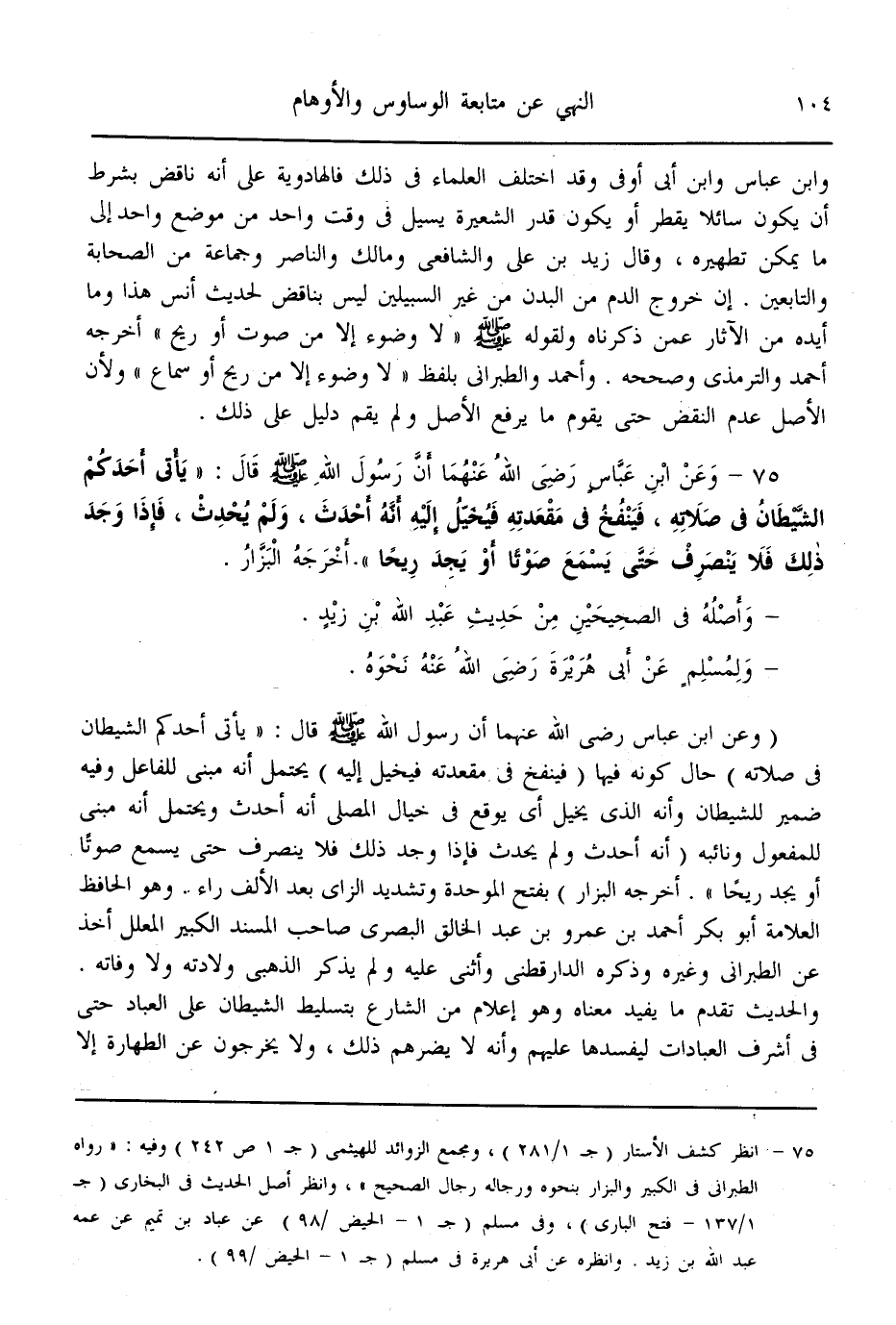 (75) - وَعَنْ ابْنِ عَبَّاسٍ - رَضِيَ اللَّهُ عَنْهُمَا - أَنَّ رَسُولَ اللَّهِ - صَلَّى اللَّهُ عَلَيْهِ وَسَلَّمَ - قَالَ: «يَأْتِي أَحَدَكُمْ الشَّيْطَانُ فِي صَلَاتِهِ، فَيَنْفُخُ فِي مَقْعَدَتِهِ فَيُخَيَّلُ إلَيْهِ أَنَّهُ أَحْدَثَ، وَلَمْ يُحْدِثْ، فَإِذَا وَجَدَ ذَلِكَ فَلَا يَنْصَرِفْ حَتَّى يَسْمَعَ صَوْتًا أَوْ يَجِدَ رِيحًا» . أَخْرَجَهُ الْبَزَّارُ - وَأَصْلُهُ فِي الصَّحِيحَيْنِ مِنْ حَدِيثِ عَبْدِ اللَّهِ بْنِ زَيْدٍ - وَلِمُسْلِمٍ عَنْ أَبِي هُرَيْرَةَ - رَضِيَ اللَّهُ عَنْهُ - نَحْوُهُ
