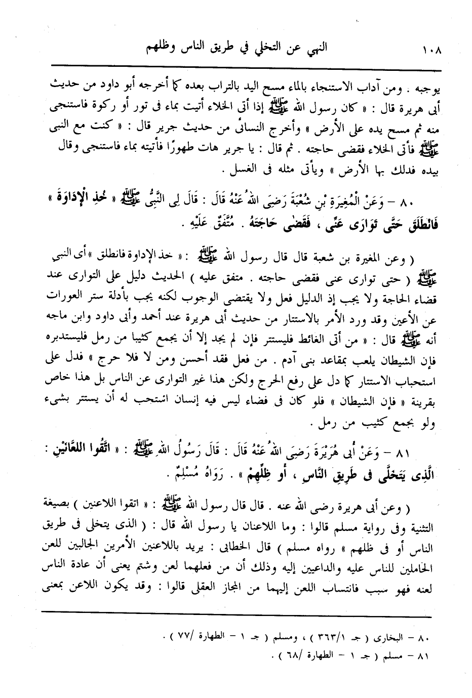 (80) - وَعَنْ «الْمُغِيرَةِ بْنِ شُعْبَةَ - رَضِيَ اللَّهُ عَنْهُ - قَالَ: قَالَ لِي النَّبِيُّ - صَلَّى اللَّهُ عَلَيْهِ وَسَلَّمَ - خُذْ الْإِدَاوَةَ فَانْطَلَقَ حَتَّى تَوَارَى عَنِّي، فَقَضَى حَاجَتَهُ» . مُتَّفَقٌ عَلَيْهِ.