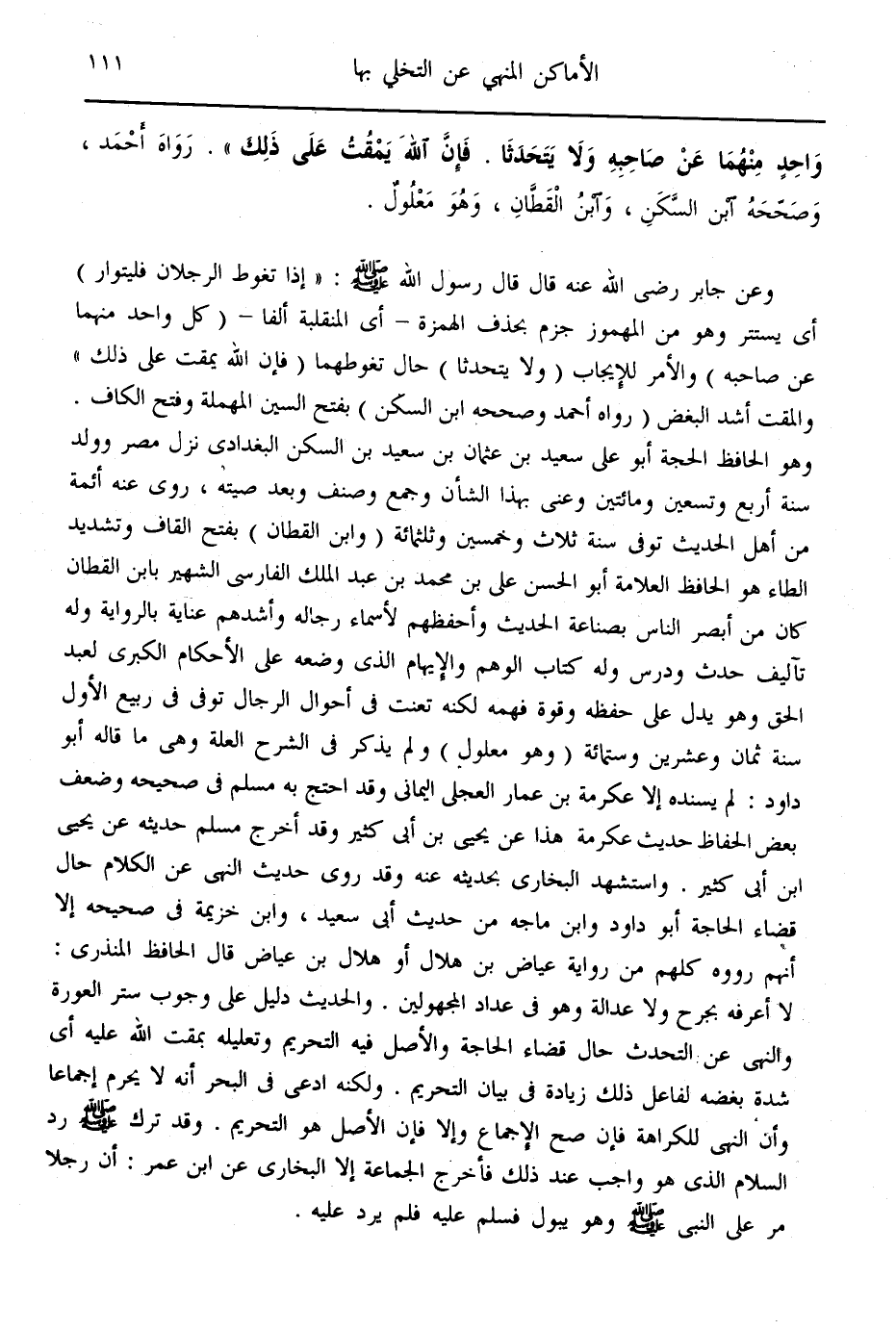 ـــــــــــــــــــــــــــــQوَاحِدٍ مِنْهُمَا عَنْ صَاحِبِهِ وَلَا يَتَحَدَّثَا. فَإِنَّ اللَّهَ يَمْقُتُ عَلَى ذَلِكَ» . رَوَاهُ أَحْمَدُ، وَصَحَّحَهُ ابْنُ السَّكَنِ، وَابْنُ الْقَطَّانِ، وَهُوَ مَعْلُولٌ. وَعَنْ جَابِرٍ " - رَضِيَ اللَّهُ عَنْهُ - قَالَ: [قَالَ رَسُولُ اللَّهِ - صَلَّى اللَّهُ عَلَيْهِ وَسَلَّمَ - «إذَا تَغَوَّطَ الرَّجُلَانِ فَلْيَتَوَارَ» أَيْ يَسْتَتِرَ، وَهُوَ مِنْ الْمَهْمُوزِ جُزِمَ بِحَذْفِ الْهَمْزَةِ، أَيْ الْمُنْقَلِبَةِ أَلِفًا [كُلُّ وَاحِدٍ مِنْهُمَا عَنْ صَاحِبِهِ] وَالْأَمْرُ لِلْإِيجَابِ [وَلَا يَتَحَدَّثَا] حَالَ تَغَوُّطِهِمَا [فَإِنَّ اللَّهَ يَمْقُتُ عَلَى ذَلِكَ] وَالْمَقْتُ: أَشَدُّ الْبُغْضِ، رَوَاهُ أَحْمَدُ، وَصَحَّحَهُ ابْنُ السَّكَنِ بِفَتْحِ السِّينِ الْمُهْمَلَةِ وَفَتْحِ الْكَافِ. وَهُوَ الْحَافِظُ الْحُجَّةُ أَبُو عَلِيٍّ سَعِيدُ بْنُ عُثْمَانَ بْنِ السَّكَنِ الْبَغْدَادِيُّ " نَزَلَ مِصْرَ، وَوُلِدَ سَنَةَ أَرْبَعٍ وَتِسْعِينَ وَمِائَتَيْنِ، وَعَنِيَ بِهَذَا الشَّأْنِ، وَجَمَعَ وَصَنَّفَ، وَبَعُدَ صِيتُهُ، رَوَى عَنْهُ أَئِمَّةٌ مِنْ أَهْلِ الْحَدِيثِ، تُوُفِّيَ سَنَةَ ثَلَاثٍ وَخَمْسِينَ وَثَلَاثِمِائَةٍ. وَابْنُ الْقَطَّانِ بِفَتْحِ الْقَافِ وَتَشْدِيدِ الطَّاءِ. هُوَ الْحَافِظُ الْعَلَّامَةُ أَبُو الْحَسَنِ عَلِيُّ بْنُ مُحَمَّدِ بْنِ عَبْدِ الْمَلِكِ الْفَارِسِيُّ " الشَّهِيرُ بِابْنِ الْقَطَّانِ، كَانَ مِنْ أَبْصَرِ النَّاسِ بِصِنَاعَةِ الْحَدِيثِ، وَأَحْفَظِهِمْ لِأَسْمَاءِ رِجَالِهِ، وَأَشَدِّهِمْ عِنَايَةً بِالرِّوَايَةِ، وَلَهُ تَأْلِيفٌ، حَدَّثَ وَدَرَّسَ، وَلَهُ كِتَابُ: الْوَهْمِ وَالْإِيهَامِ " الَّذِي وَضَعَهُ عَلَى الْأَحْكَامِ الْكُبْرَى لِعَبْدِ الْحَقِّ، وَهُوَ يَدُلُّ عَلَى حِفْظِهِ، وَقُوَّةِ فَهْمِهِ، لَكِنَّهُ تَعَنَّتَ فِي أَحْوَالِ الرِّجَالِ، تُوُفِّيَ فِي رَبِيعٍ الْأَوَّلِ سَنَةَ ثَمَانٍ وَعِشْرِينَ وَسِتِّمِائَةٍ. وَهُوَ مَعْلُولٌ: وَلَمْ يَذْكُرْ فِي الشَّرْحِ الْعِلَّةَ، وَهُوَ مَا قَالَهُ أَبُو دَاوُد، لَمْ يُسْنِدْهُ إلَّا عِكْرِمَةُ بْنُ عَمَّارٍ الْعِجْلِيُّ الْيَمَانِيُّ، وَقَدْ احْتَجَّ بِهِ مُسْلِمٌ فِي صَحِيحِهِ، وَضَعَّفَ بَعْضُ الْحُفَّاظِ حَدِيثَ عِكْرِمَةَ هَذَا عَنْ يَحْيَى بْنِ أَبِي كَثِيرٍ، وَقَدْ أَخْرَجَ مُسْلِمٌ حَدِيثَهُ عَنْ يَحْيَى بْنِ أَبِي كَثِيرٍ، وَاسْتَشْهَدَ الْبُخَارِيُّ بِحَدِيثِهِ عَنْهُ، وَقَدْ رَوَى حَدِيثَ النَّهْيِ عَنْ الْكَلَامِ حَالَ قَضَاءِ الْحَاجَةِ أَبُو دَاوُد، وَابْنُ مَاجَهْ، مِنْ حَدِيثِ أَبِي سَعِيدٍ، وَابْنِ خُزَيْمَةَ فِي صَحِيحِهِ، إلَّا أَنَّهُمْ رَوَوْهُ كُلُّهُمْ مِنْ رِوَايَةِ عِيَاضِ بْنِ هِلَالٍ، أَوْ هِلَالِ بْنِ عِيَاضٍ، قَالَ الْحَافِظُ الْمُنْذِرِيُّ: لَا أَعْرِفُهُ بِجُرْحٍ وَلَا عَدَالَةٍ، وَهُوَ فِي عِدَادِ الْمَجْهُولِينَ.