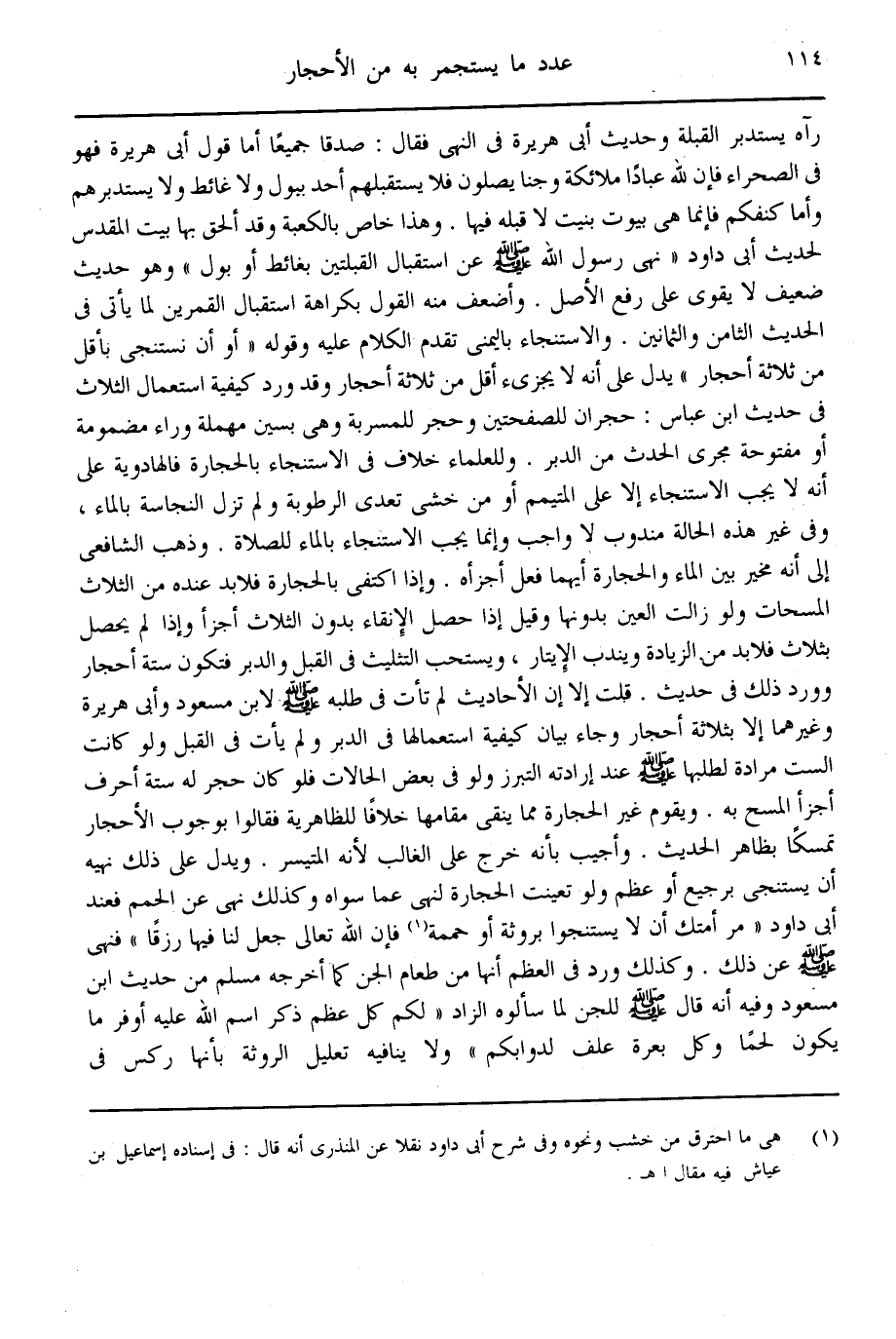 قُلْت: إلَّا أَنَّ الْأَحَادِيثَ لَمْ تَأْتِ فِي طَلَبِهِ - صَلَّى اللَّهُ عَلَيْهِ وَسَلَّمَ - لِابْنِ مَسْعُودٍ، وَأَبِي هُرَيْرَةَ، وَغَيْرِهِمَا إلَّا بِثَلَاثَةِ أَحْجَارٍ، وَجَاءَ بَيَانُ كَيْفِيَّةِ اسْتِعْمَالِهَا فِي الدُّبُرِ، وَلَمْ يَأْتِ فِي الْقُبُلِ، وَلَوْ كَانَتْ السِّتُّ مُرَادَةً لِطَلَبِهَا - صَلَّى اللَّهُ عَلَيْهِ وَسَلَّمَ - عِنْدَ إرَادَتِهِ التَّبَرُّزَ، وَلَوْ فِي بَعْضِ الْحَالَاتِ، فَلَوْ كَانَ حَجَرٌ لَهُ سِتَّةُ أَحْرُفٍ أَجْزَأَ الْمَسْحُ بِهِ، وَيَقُومُ غَيْرُ الْحِجَارَةِ مِمَّا يُنَقِّي مَقَامَهَا، خِلَافًا لِلظَّاهِرِيَّةِ فَقَالُوا بِوُجُوبِ الْأَحْجَارِ تَمَسُّكًا بِظَاهِرِ الْحَدِيثِ.