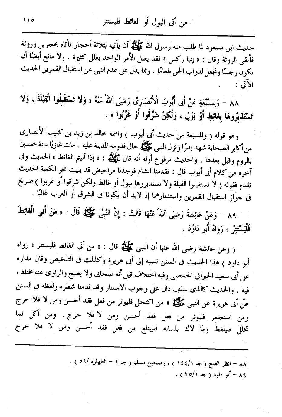 (88) - وَلِلسَّبْعَةِ عَنْ أَبِي أَيُّوبَ الْأَنْصَارِيِّ - رَضِيَ اللَّهُ عَنْهُ - «وَلَا تَسْتَقْبِلُوا الْقِبْلَةَ وَلَا تَسْتَدْبِرُوهَا بِغَائِطٍ أَوْ بَوْلٍ وَلَكِنْ شَرِّقُوا أَوْ غَرِّبُوا» .