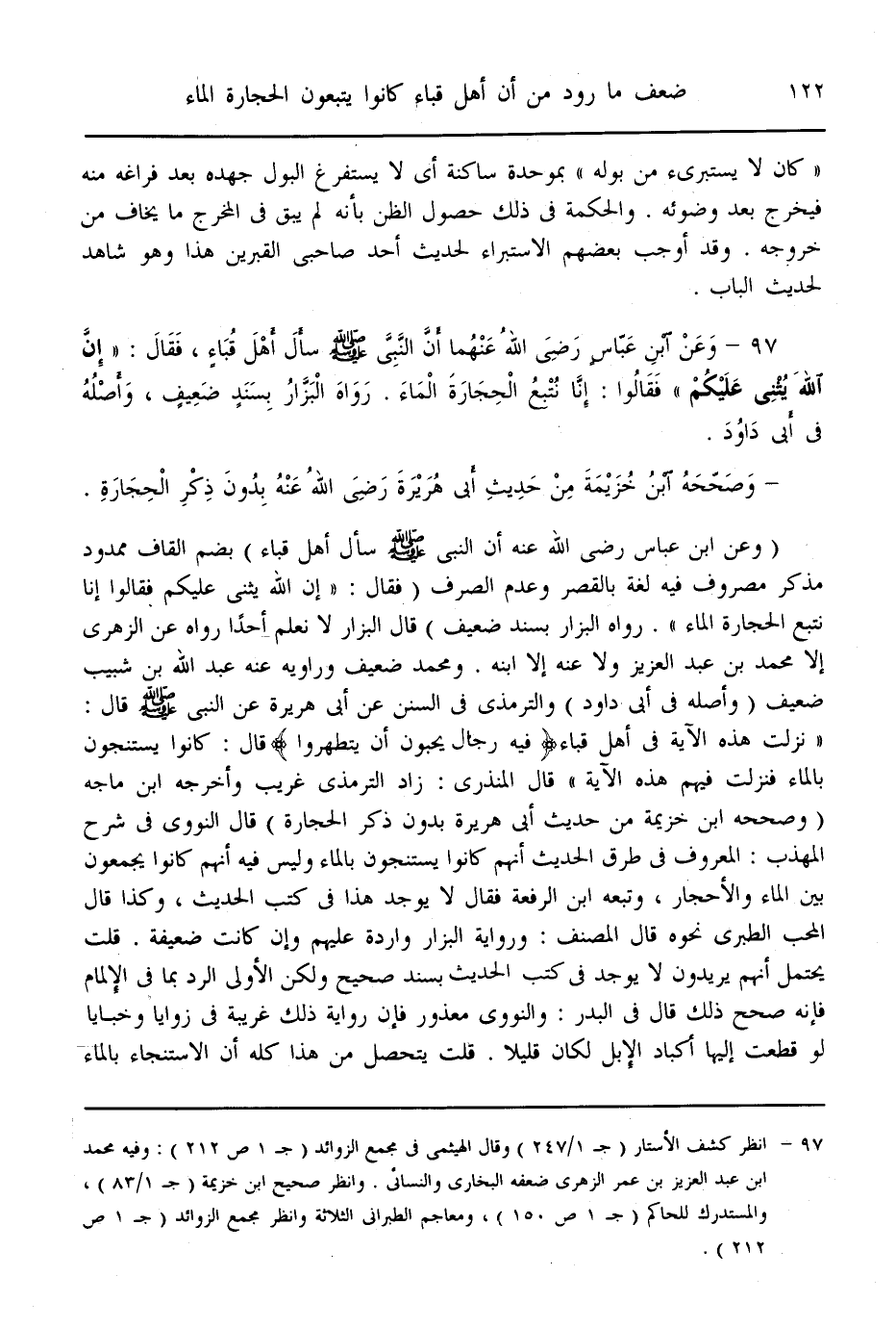 (97) وَعَنْ ابْنِ عَبَّاسٍ - رَضِيَ اللَّهُ عَنْهُمَا - «أَنَّ النَّبِيَّ - صَلَّى اللَّهُ عَلَيْهِ وَسَلَّمَ - سَأَلَ أَهْلَ قُبَاءَ، فَقَالَ: إنَّ اللَّهَ يُثْنِي عَلَيْكُمْ قَالُوا: إنَّا نُتْبِعُ الْحِجَارَةَ الْمَاءَ.» رَوَاهُ الْبَزَّارُ بِسَنَدٍ ضَعِيفٍ، وَأَصْلُهُ فِي أَبِي دَاوُد وَصَحَّحَهُ ابْنُ خُزَيْمَةَ مِنْ حَدِيثِ أَبِي هُرَيْرَةَ - رَضِيَ اللَّهُ عَنْهُ - بِدُونِ ذِكْرِ الْحِجَارَةِ.