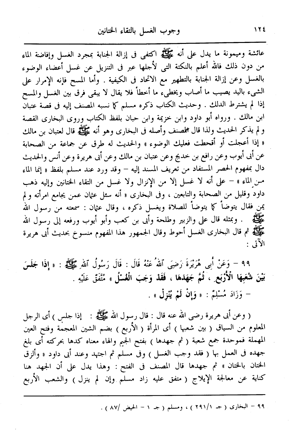 (99) - وَعَنْ أَبِي هُرَيْرَةَ - رَضِيَ اللَّهُ عَنْهُ - قَالَ: قَالَ رَسُولُ اللَّهِ - صَلَّى اللَّهُ عَلَيْهِ وَسَلَّمَ - «إذَا جَلَسَ بَيْنَ شُعَبِهَا الْأَرْبَعِ، ثُمَّ جَهَدهَا، فَقَدْ وَجَبَ الْغُسْلُ» مُتَّفَقٌ عَلَيْهِ - وَزَادَ مُسْلِمٌ: " وَإِنْ لَمْ يُنْزِلْ ".