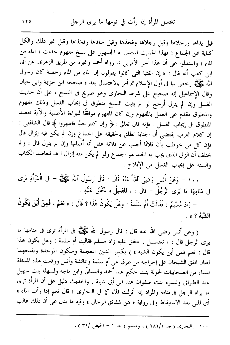 (100) - وَعَنْ أَنَسٍ - رَضِيَ اللَّهُ عَنْهُ - قَالَ: «قَالَ رَسُولُ اللَّهِ - صَلَّى اللَّهُ عَلَيْهِ وَسَلَّمَ - فِي الْمَرْأَةِ تَرَى فِي مَنَامِهَا مَا يَرَى الرَّجُلُ - قَالَ: تَغْتَسِلُ» مُتَّفَقٌ عَلَيْهِ - زَادَ مُسْلِمٌ: «فَقَالَتْ أُمُّ سَلَمَةَ: وَهَلْ يَكُونُ هَذَا؟ قَالَ: نَعَمْ، فَمِنْ أَيْنَ يَكُونُ الشِّبْهُ» .