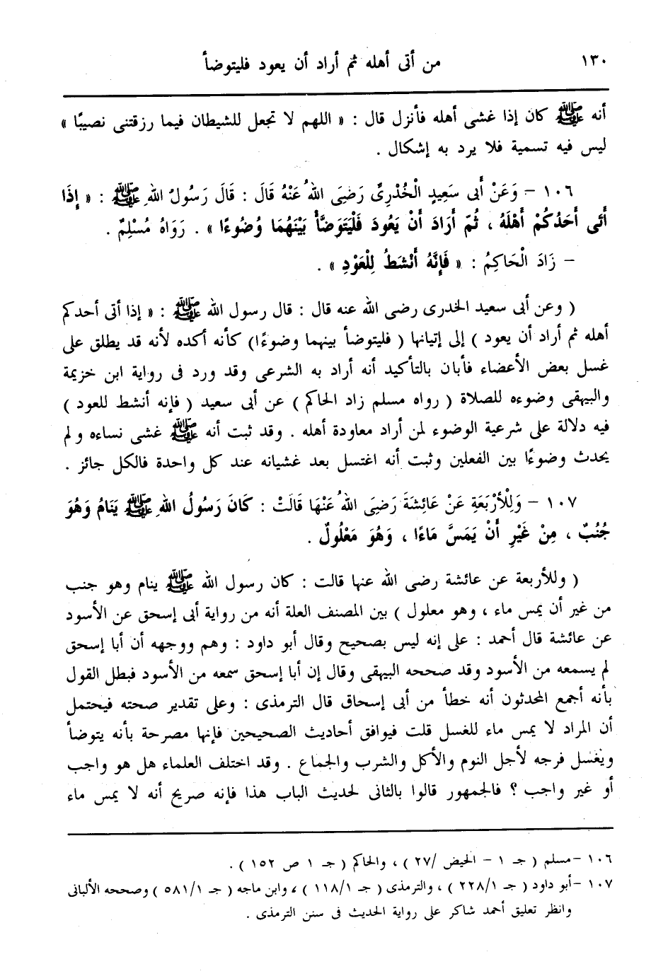 (106) - وَعَنْ أَبِي سَعِيدٍ الْخُدْرِيِّ - رَضِيَ اللَّهُ عَنْهُ - قَالَ: قَالَ رَسُولُ اللَّهِ - صَلَّى اللَّهُ عَلَيْهِ وَسَلَّمَ - «إذَا أَتَى أَحَدُكُمْ أَهْلَهُ، ثُمَّ أَرَادَ أَنْ يَعُودَ فَلْيَتَوَضَّأْ بَيْنَهُمَا وُضُوءًا» . رَوَاهُ مُسْلِمٌ - زَادَ الْحَاكِمُ «فَإِنَّهُ أَنْشَطُ لِلْعَوْدِ» .