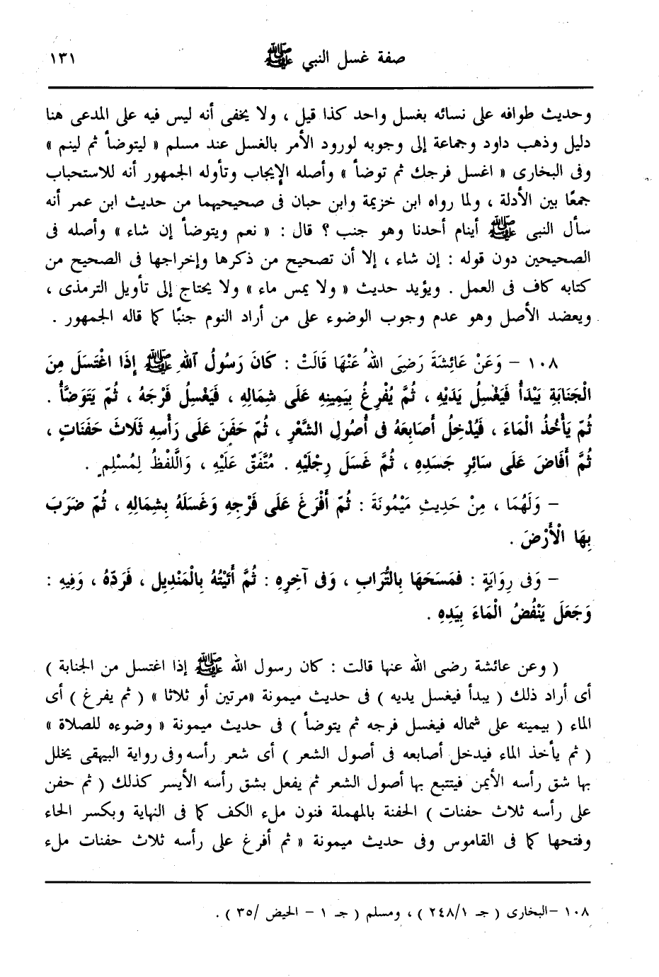(108) - وَعَنْ عَائِشَةَ - رَضِيَ اللَّهُ عَنْهَا - قَالَتْ «كَانَ رَسُولُ اللَّهِ - صَلَّى اللَّهُ عَلَيْهِ وَسَلَّمَ - إذَا اغْتَسَلَ مِنْ الْجَنَابَةِ يَبْدَأُ فَيَغْسِلُ يَدَيْهِ، ثُمَّ يُفْرِغُ بِيَمِينِهِ عَلَى شِمَالِهِ، فَيَغْسِلُ فَرْجَهُ، ثُمَّ يَتَوَضَّأُ. ثُمَّ يَأْخُذُ الْمَاءَ، فَيُدْخِلُ أَصَابِعَهُ فِي أُصُولِ الشَّعْرِ، ثُمَّ حَفَنَ عَلَى رَأْسِهِ ثَلَاثَ حَفَنَاتٍ، ثُمَّ أَفَاضَ عَلَى سَائِرِ جَسَدِهِ، ثُمَّ غَسَلَ رِجْلَيْهِ» . مُتَّفَقٌ عَلَيْهِ، وَاللَّفْظُ لِمُسْلِمٍ.