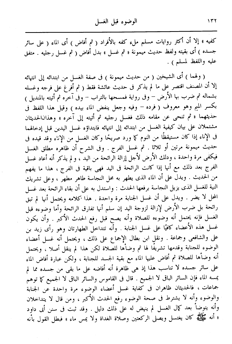 وَيَدُلُّ عَلَى أَنَّ الْمَاءَ الَّذِي يُطَهَّرُ بِهِ مَحَلُّ النَّجَاسَةِ طَاهِرٌ مُطَهِّرٌ، وَعَلَى تَشْرِيكِ النِّيَّةِ لِلْغُسْلِ الَّذِي يُزِيلُ النَّجَاسَةِ بِرَفْعِهَا الْحَدَثَ، وَيُسْتَدَلُّ بِهِ عَلَى أَنَّ بَقَاءَ الرَّائِحَةِ بَعْدَ غَسْلِ الْمَحَلِّ لَا يَضُرُّ، وَيَدُلُّ عَلَى أَنَّ غُسْلَ الْجَنَابَةِ مَرَّةٌ وَاحِدَةٌ، هَذَا كَلَامُهُ وَيَحْتَمِلُ أَنَّهَا لَمْ تَبْقَ رَائِحَةٌ بَلْ ضَرَبَ الْأَرْضَ لِإِزَالَةِ لُزُوجَةِ الْيَدِ إنْ سُلِّمَ أَنَّهَا تُفَارِقُ الرَّائِحَةَ، وَأَمَّا وُضُوءُهُ قَبْلَ الْغُسْلِ فَإِنَّهُ يَحْتَمِلُ أَنَّهُ وُضُوءُهُ لِلصَّلَاةِ، وَأَنَّهُ يَصِحُّ قَبْلَ رَفْعِ الْحَدَثِ الْأَكْبَرِ؛ وَأَنْ يَكُونَ غَسْلُ هَذِهِ الْأَعْضَاءِ كَافِيًا عَنْ غُسْلِ الْجَنَابَةِ، وَأَنَّهُ تَتَدَاخَلُ الطَّهَارَتَانِ، وَهُوَ رَأْيُ " زَيْدِ بْنِ عَلِيٍّ " وَالشَّافِعِيِّ وَجَمَاعَةٌ، وَنَقَلَ ابْنُ بَطَّالٍ الْإِجْمَاعَ عَلَى ذَلِكَ، وَيُحْتَمَلُ أَنَّهُ غَسَلَ أَعْضَاءَ الْوُضُوءِ لِلْجَنَابَةِ وَقَدَّمَهَا تَشْرِيفًا لَهَا، ثُمَّ وَضَّأَهَا لِلصَّلَاةِ، لَكِنْ هَذَا لَمْ يُنْقَلْ أَصْلًا، وَيَحْتَمِلُ أَنَّهُ وَضَّأَهَا لِلصَّلَاةِ ثُمَّ أَفَاضَ عَلَيْهَا الْمَاءَ مَعَ بَقِيَّةِ الْجَسَدِ لِلْجَنَابَةِ، وَلَكِنَّ عِبَارَةَ: أَفَاضَ الْمَاءَ عَلَى سَائِرِ جَسَدِهِ، لَا تُنَاسِبُ هَذَا؛ إذْ هِيَ ظَاهِرَةٌ أَنَّهُ أَفَاضَهُ عَلَى مَا بَقِيَ مِنْ جَسَدِهِ مِمَّا لَمْ يَمَسَّهُ الْمَاءُ، فَإِنَّ السَّائِرَ الْبَاقِي لَا الْجَمِيعُ؛ قَالَ فِي الْقَامُوسِ: وَالسَّائِرُ الْبَاقِي لَا الْجَمِيعُ كَمَا تَوَهَّمَ جَمَاعَاتٌ فَالْحَدِيثَانِ ظَاهِرَانِ فِي كِفَايَةِ غَسْلِ أَعْضَاءِ الْوُضُوءِ مَرَّةً وَاحِدَةً عَنْ الْجَنَابَةِ وَالْوُضُوءِ، وَأَنَّهُ لَا يُشْتَرَطُ فِي صِحَّةِ الْوُضُوءِ رَفْعُ الْحَدَثِ الْأَكْبَرِ، وَمَنْ قَالَ: لَا يَتَدَاخَلَانِ، وَأَنَّهُ يَتَوَضَّأُ بَعْدَ كَمَالِ الْغُسْلِ، لَمْ يَنْهَضْ لَهُ عَلَى ذَلِكَ دَلِيلٌ؛ وَقَدْ ثَبَتَ فِي سُنَنِ أَبِي دَاوُد «أَنَّهُ - صَلَّى اللَّهُ عَلَيْهِ وَسَلَّمَ - كَانَ يَغْتَسِلُ وَيُصَلِّي الرَّكْعَتَيْنِ وَصَلَاةَ الْغَدَاةِ وَلَا يَمَسُّ مَاءً» فَبَطَلَ الْقَوْلُ بِأَنَّهُ