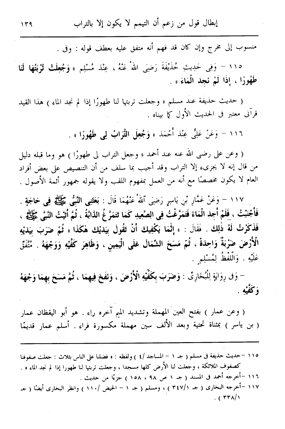 (117) - وَعَنْ «عَمَّارِ بْنِ يَاسِرٍ - رَضِيَ اللَّهُ عَنْهُمَا - قَالَ: بَعَثَنِي النَّبِيُّ - صَلَّى اللَّهُ عَلَيْهِ وَسَلَّمَ - فِي حَاجَةٍ. فَأَجْنَبْت، فَلَمْ أَجِدْ الْمَاءَ فَتَمَرَّغْت فِي الصَّعِيدِ كَمَا تَتَمَرَّغُ الدَّابَّةُ، ثُمَّ أَتَيْت النَّبِيَّ - صَلَّى اللَّهُ عَلَيْهِ وَسَلَّمَ - فَذَكَرْت لَهُ ذَلِكَ. فَقَالَ: إنَّمَا يَكْفِيك أَنْ تَقُولَ بِيَدَيْك هَكَذَا ثُمَّ ضَرَبَ بِيَدَيْهِ الْأَرْضَ ضَرْبَةً وَاحِدَةً، ثُمَّ مَسَحَ الشِّمَالَ عَلَى الْيَمِينِ، وَظَاهِرَ كَفَّيْهِ وَوَجْهَهُ» . مُتَّفَقٌ عَلَيْهِ. وَاللَّفْظُ لِمُسْلِمٍ.