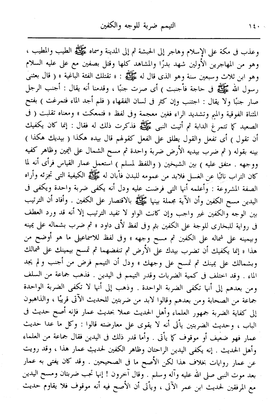 وَأَمَّا قَدْرُ ذَلِكَ فِي الْيَدَيْنِ فَقَالَ جَمَاعَةٌ مِنْ الْعُلَمَاءِ وَأَهْلِ الْحَدِيثِ: إنَّهُ يَكْفِي فِي الْيَدَيْنِ الرَّاحَتَانِ وَظَاهِرُ الْكَفَّيْنِ لِحَدِيثِ " عَمَّارٍ " هَذَا. وَقَدْ رُوِيَتْ عَنْ " عَمَّارٍ " رِوَايَاتٌ بِخِلَافِ هَذَا؛ لَكِنَّ الْأَصَحَّ مَا فِي الصَّحِيحَيْنِ. وَقَدْ كَانَ يُفْتِي بِهِ بَعْدَ مَوْتِ النَّبِيِّ - صَلَّى اللَّهُ عَلَيْهِ وَآلِهِ وَسَلَّمَ -.
