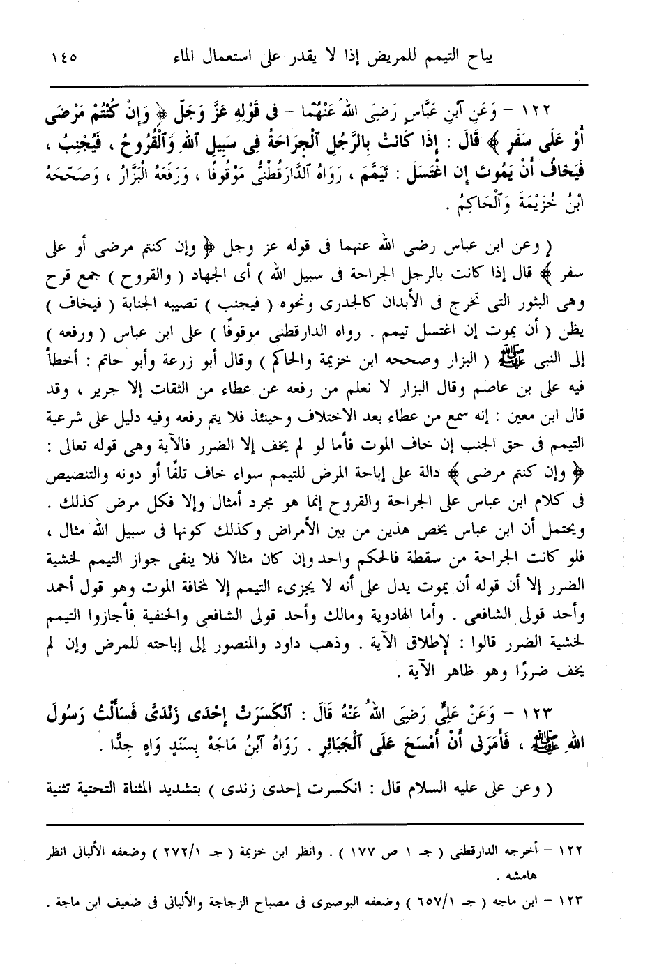 (123) - وَعَنْ «عَلِيٍّ - رَضِيَ اللَّهُ عَنْهُ - قَالَ: انْكَسَرَتْ إحْدَى زَنْدَيَّ فَسَأَلَتْ رَسُولَ اللَّهِ - صَلَّى اللَّهُ عَلَيْهِ وَسَلَّمَ -، فَأَمَرَنِي أَنْ أَمْسَحَ عَلَى الْجَبَائِرِ» . رَوَاهُ ابْنُ مَاجَهْ بِسَنَدٍ وَاهٍ جِدًّا
