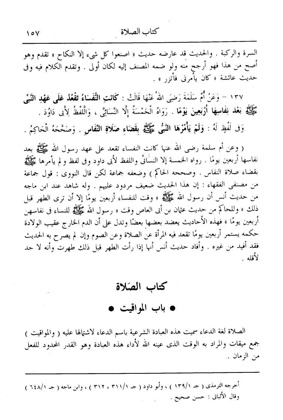 (137) - وَعَنْ أُمِّ سَلَمَةَ - رَضِيَ اللَّهُ عَنْهَا - قَالَتْ: «كَانَتْ النُّفَسَاءُ تَقْعُدُ عَلَى عَهْدِ النَّبِيِّ - صَلَّى اللَّهُ عَلَيْهِ وَسَلَّمَ - بَعْدَ نِفَاسِهَا أَرْبَعِينَ يَوْمًا» . رَوَاهُ الْخَمْسَةُ إلَّا النَّسَائِيّ، وَاللَّفْظُ لِأَبِي دَاوُد. وَفِي لَفْظٍ لَهُ: وَلَمْ يَأْمُرْهَا النَّبِيُّ - صَلَّى اللَّهُ عَلَيْهِ وَسَلَّمَ - بِقَضَاءِ صَلَاةِ النِّفَاسِ. وَصَحَّحَهُ الْحَاكِمُ.
