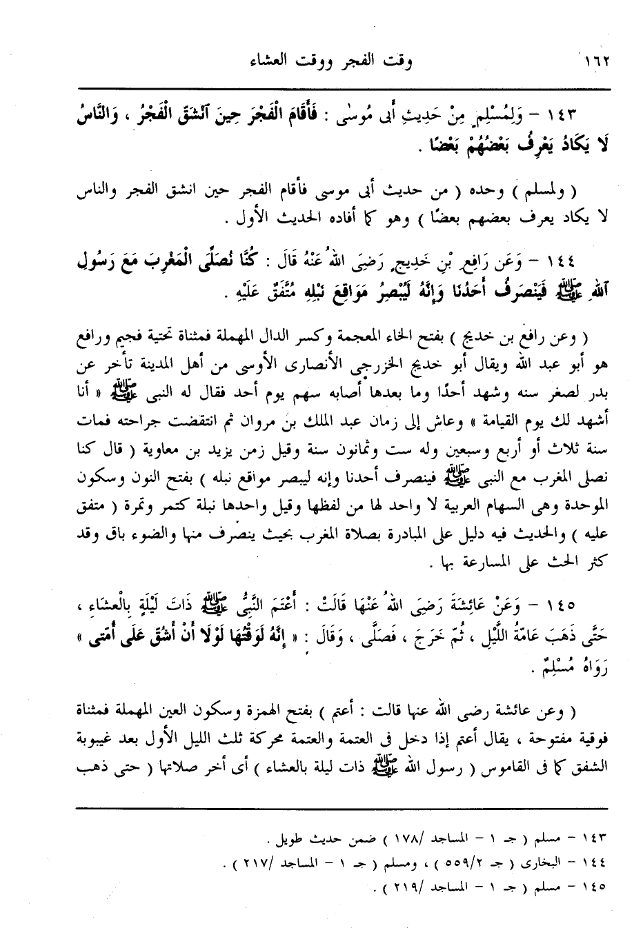 (144) - وَعَنْ رَافِعِ بْنِ خَدِيجٍ - رَضِيَ اللَّهُ عَنْهُ - قَالَ: «كُنَّا نُصَلِّي الْمَغْرِبَ مَعَ رَسُولِ اللَّهِ - صَلَّى اللَّهُ عَلَيْهِ وَسَلَّمَ - فَيَنْصَرِفُ أَحَدُنَا وَإِنَّهُ لَيُبْصِرُ مَوَاقِعَ نَبْلِهِ» مُتَّفَقٌ عَلَيْهِ.
