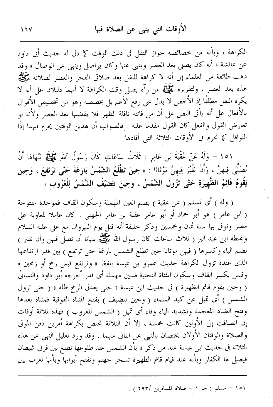 (151) - وَلَه عَنْ عُقْبَةَ بْنِ عَامِرٍ: «ثَلَاثُ سَاعَاتٍ كَانَ رَسُولُ اللَّهِ - صَلَّى اللَّهُ عَلَيْهِ وَسَلَّمَ - يَنْهَانَا أَنْ نُصَلِّيَ فِيهِنَّ، وَأَنْ نَقْبُرَ فِيهِنَّ مَوْتَانَا: حِينَ تَطْلُعُ الشَّمْسُ بَازِغَةً حَتَّى تَرْتَفِعَ، وَحِينَ يَقُومُ قَائِمُ الظَّهِيرَةِ حَتَّى تَزُولَ الشَّمْسُ، وَحِين تَتَضَيَّفُ الشَّمْسُ لِلْغُرُوبِ» .