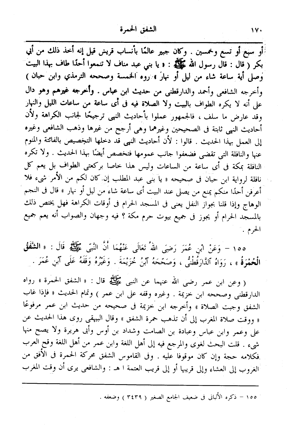 (155) - وَعَنْ ابْنِ عُمَرَ - رَضِيَ اللَّهُ تَعَالَى عَنْهُمَا - أَنَّ النَّبِيَّ - صَلَّى اللَّهُ عَلَيْهِ وَسَلَّمَ - قَالَ: «الشَّفَقُ الْحُمْرَةُ» ، رَوَاهُ الدَّارَقُطْنِيُّ، وَصَحَّحَهُ ابْنُ خُزَيْمَةَ. وَغَيْرُهُ وَقَفَهُ عَلَى ابْنِ عُمَرَ.