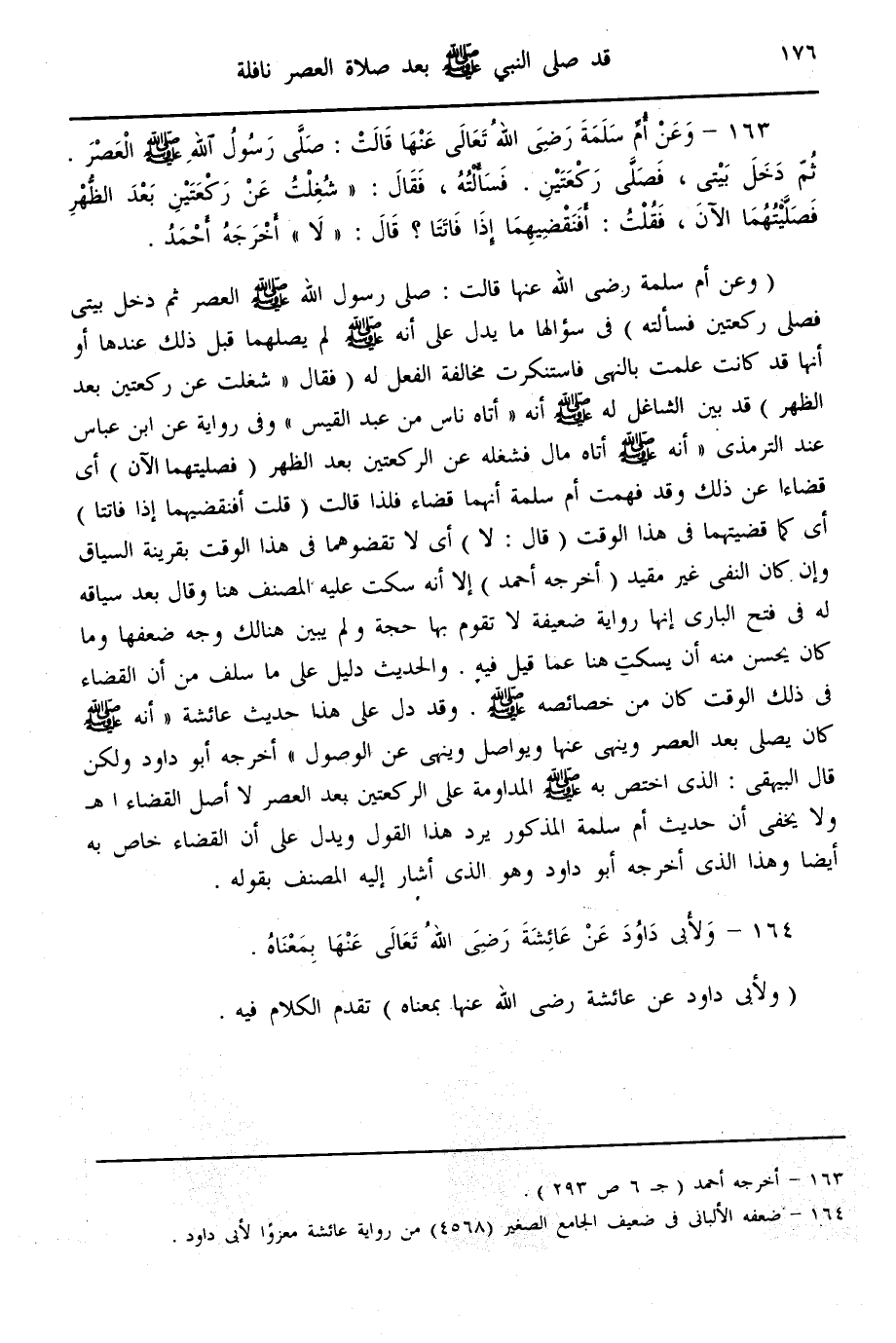 (163) - وَعَنْ أُمِّ سَلَمَةَ - رَضِيَ اللَّهُ تَعَالَى عَنْهَا - قَالَتْ: «صَلَّى رَسُولُ اللَّهِ - صَلَّى اللَّهُ عَلَيْهِ وَسَلَّمَ - الْعَصْرَ، ثُمَّ دَخَلَ بَيْتِي، فَصَلَّى رَكْعَتَيْنِ. فَسَأَلْته، فَقَالَ: شُغِلْت عَنْ رَكْعَتَيْنِ بَعْدَ الظُّهْرِ فَصَلَّيْتهمَا الْآنَ، فَقُلْت: أَفَنَقْضِيهِمَا إذَا فَاتَتَا؟ قَالَ: لَا» أَخْرَجَهُ أَحْمَدُ
