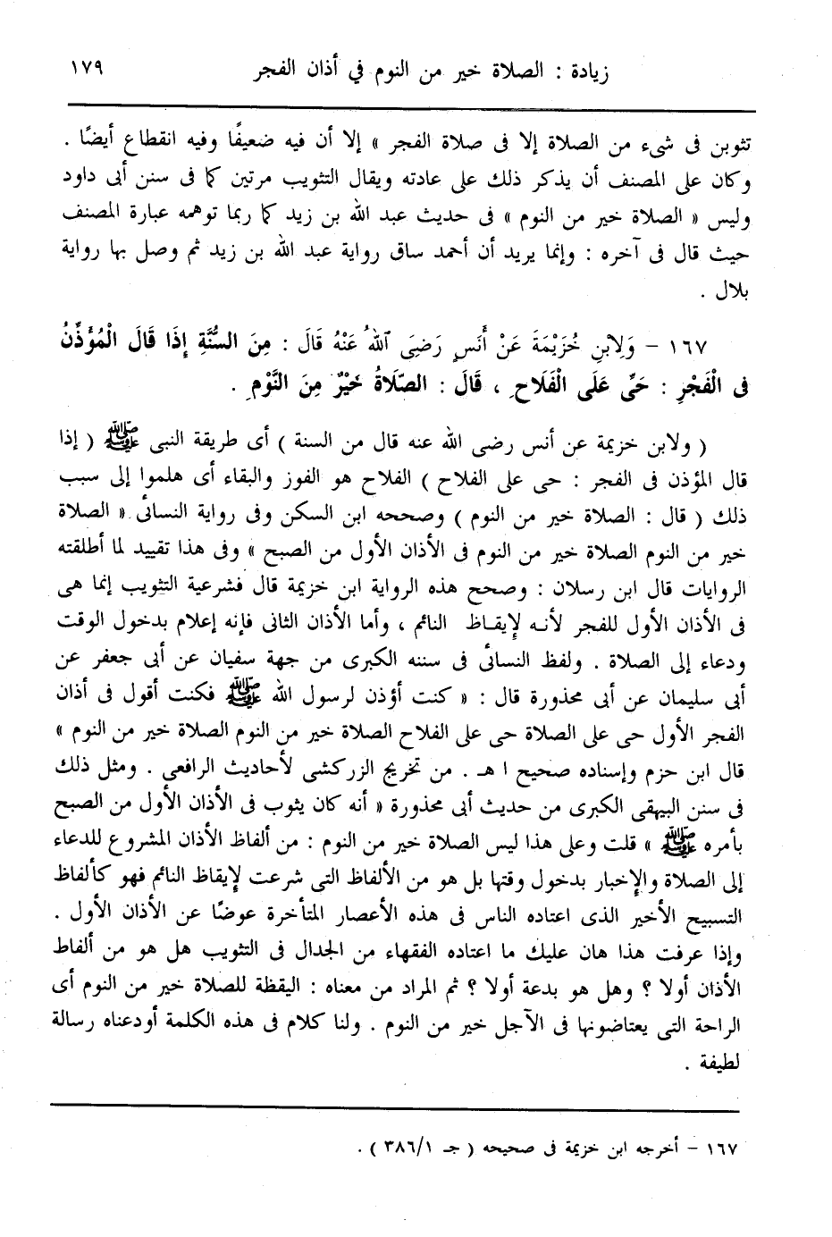 (167) - وَلِابْنِ خُزَيْمَةَ عَنْ أَنَسٍ - رَضِيَ اللَّهُ عَنْهُ - قَالَ: «مِنْ السُّنَّةِ إذَا قَالَ الْمُؤَذِّنُ فِي الْفَجْرِ: حَيَّ عَلَى الْفَلَاحِ، قَالَ: الصَّلَاةُ خَيْرٌ مِنْ النَّوْمِ»