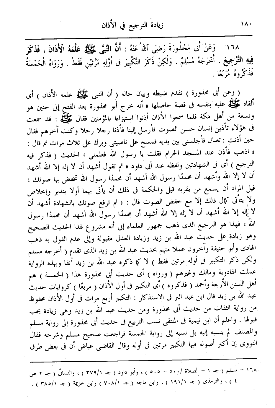 (168) - «وَعَنْ أَبِي مَحْذُورَةَ - رَضِيَ اللَّهُ عَنْهُ -: أَنَّ النَّبِيَّ - صَلَّى اللَّهُ عَلَيْهِ وَسَلَّمَ - عَلَّمَهُ الْأَذَانَ، فَذَكَرَ فِيهِ التَّرْجِيعَ» . أَخْرَجَهُ مُسْلِمٌ. وَلَكِنْ ذَكَرَ التَّكْبِيرَ فِي أَوَّلِهِ مَرَّتَيْنِ فَقَطْ. رَوَاهُ الْخَمْسَةُ فَذَكَرُوهُ مُرَبَّعًا