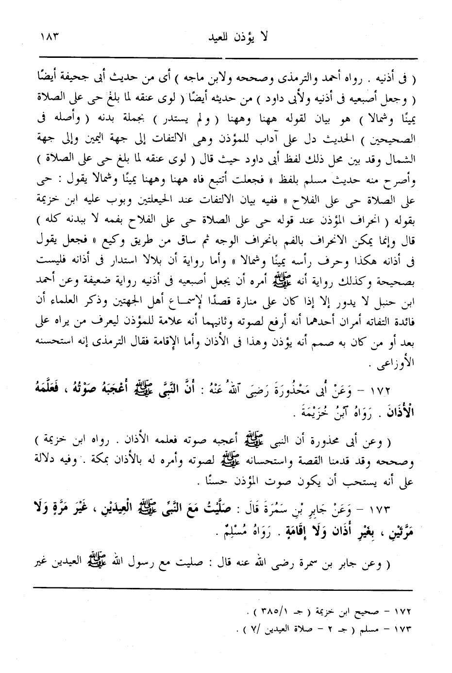 (173) - وَعَنْ جَابِرِ بْنِ سَمُرَةَ قَالَ: «صَلَّيْت مَعَ النَّبِيِّ - صَلَّى اللَّهُ عَلَيْهِ وَسَلَّمَ - الْعِيدَيْنِ، غَيْرَ مَرَّةٍ وَلَا مَرَّتَيْنِ، بِغَيْرِ أَذَانٍ وَلَا إقَامَةٍ» . رَوَاهُ مُسْلِمٌ