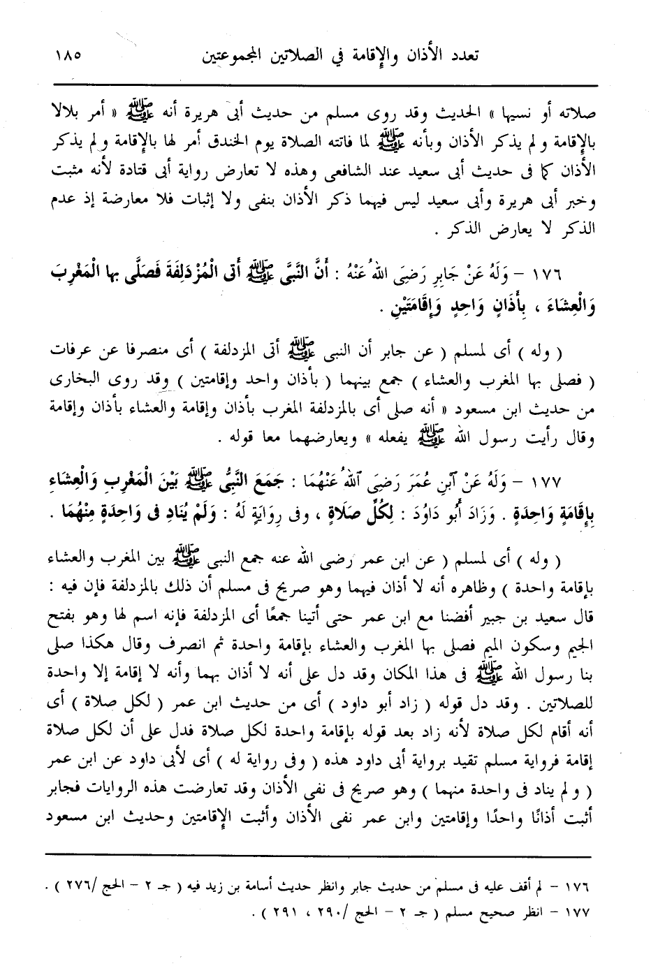 (176) - وَلَهُ عَنْ جَابِرٍ - رَضِيَ اللَّهُ عَنْهُ -: «أَنَّ النَّبِيَّ - صَلَّى اللَّهُ عَلَيْهِ وَسَلَّمَ - أَتَى الْمُزْدَلِفَةَ فَصَلَّى بِهَا الْمَغْرِبَ وَالْعِشَاءَ، بِأَذَانٍ وَاحِدٍ وَإِقَامَتَيْنِ»