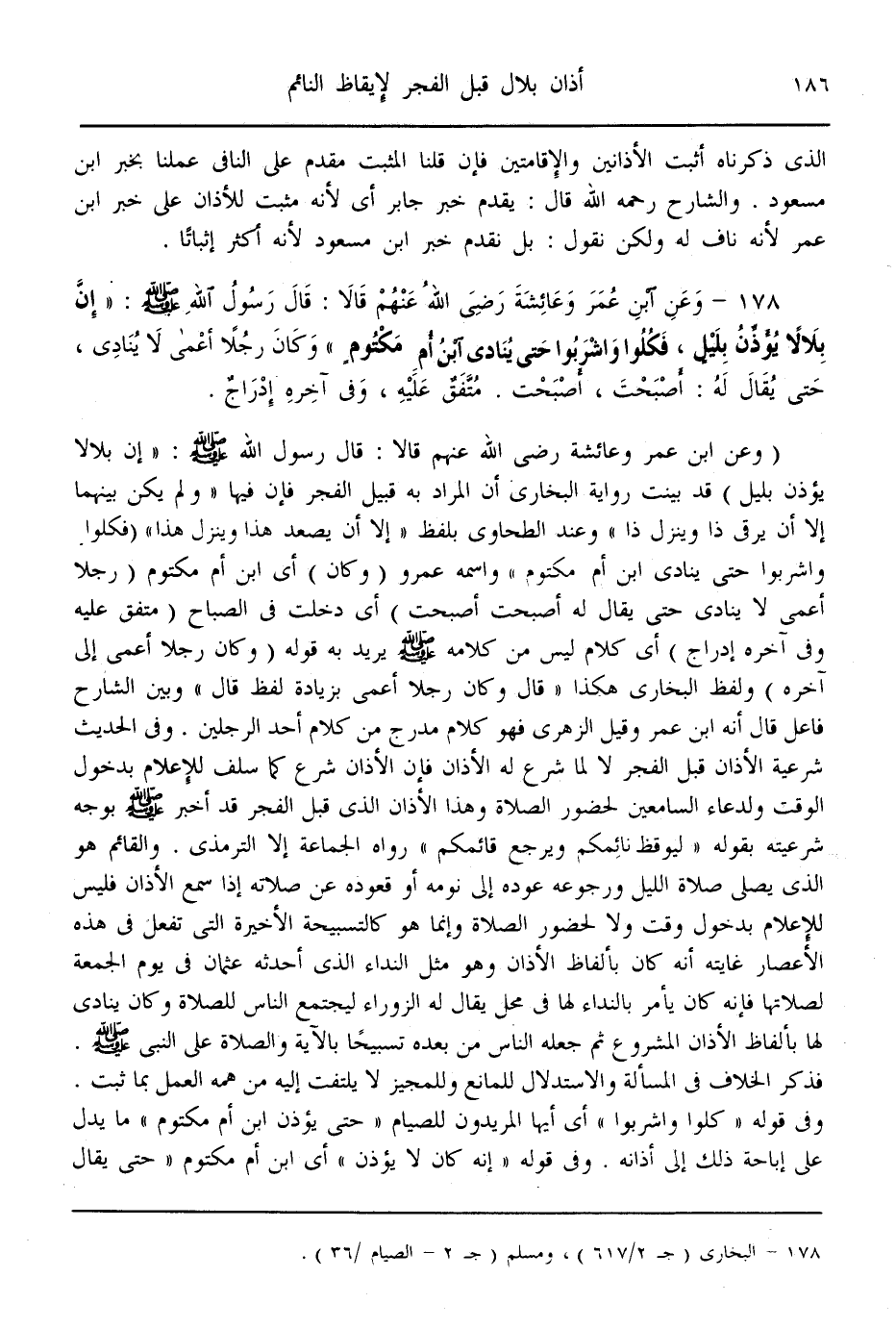(178) - وَعَنْ ابْنِ عُمَرَ وَعَائِشَةَ - رَضِيَ اللَّهُ عَنْهُمْ - قَالَا: قَالَ رَسُولُ اللَّهِ - صَلَّى اللَّهُ عَلَيْهِ وَسَلَّمَ - «إنَّ بِلَالًا يُؤَذِّنُ بِلَيْلٍ، فَكُلُوا وَاشْرَبُوا حَتَّى يُنَادِيَ ابْنُ أُمِّ مَكْتُومٍ وَكَانَ رَجُلًا أَعْمَى لَا يُنَادِي، حَتَّى يُقَالَ لَهُ: أَصْبَحْت، أَصْبَحْت» . مُتَّفَقٌ عَلَيْهِ، وَفِي آخِرِهِ إدْرَاجٌ