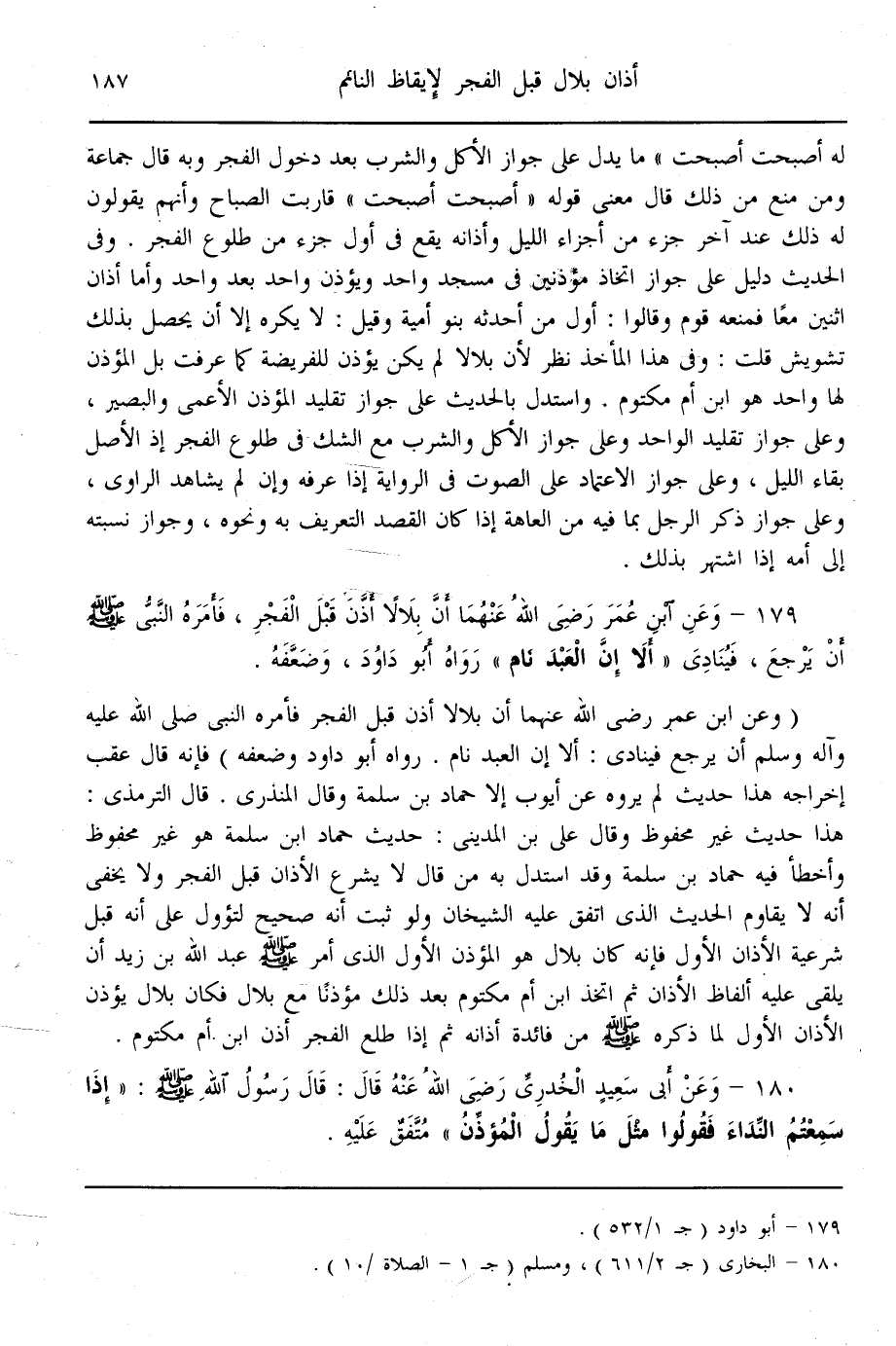 (179) - وَعَنْ ابْنِ عُمَرَ - رَضِيَ اللَّهُ عَنْهُمَا - «أَنَّ بِلَالًا أَذَّنَ قَبْلَ الْفَجْرِ، فَأَمَرَهُ النَّبِيُّ - صَلَّى اللَّهُ عَلَيْهِ وَسَلَّمَ - أَنْ يَرْجِعَ، فَيُنَادِيَ أَلَا إنَّ الْعَبْدَ نَامَ» رَوَاهُ أَبُو دَاوُد، وَضَعَّفَهُ.