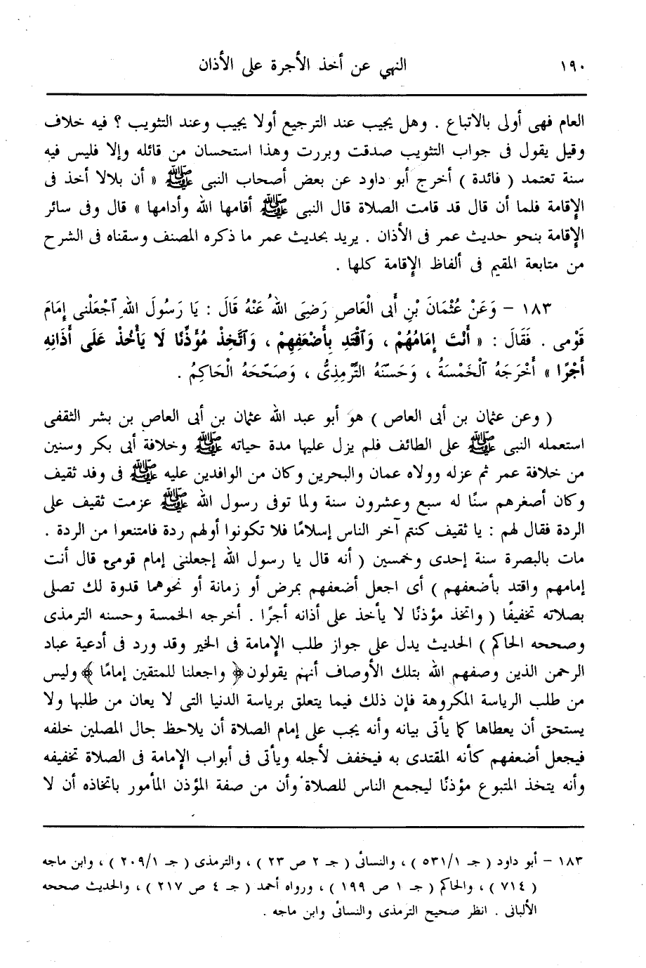 (183) - وَعَنْ عُثْمَانَ بْنِ أَبِي الْعَاصِ - رَضِيَ اللَّهُ عَنْهُ - قَالَ: «يَا رَسُولَ اللَّهِ اجْعَلْنِي إمَامَ قَوْمِي. فَقَالَ: أَنْتَ إمَامُهُمْ، وَاقْتَدِ بِأَضْعَفِهِمْ، وَاِتَّخِذْ مُؤَذِّنًا لَا يَأْخُذُ عَلَى أَذَانِهِ أَجْرًا» أَخْرَجَهُ الْخَمْسَةُ، وَحَسَّنَهُ التِّرْمِذِيُّ، وَصَحَّحَهُ الْحَاكِمُ.