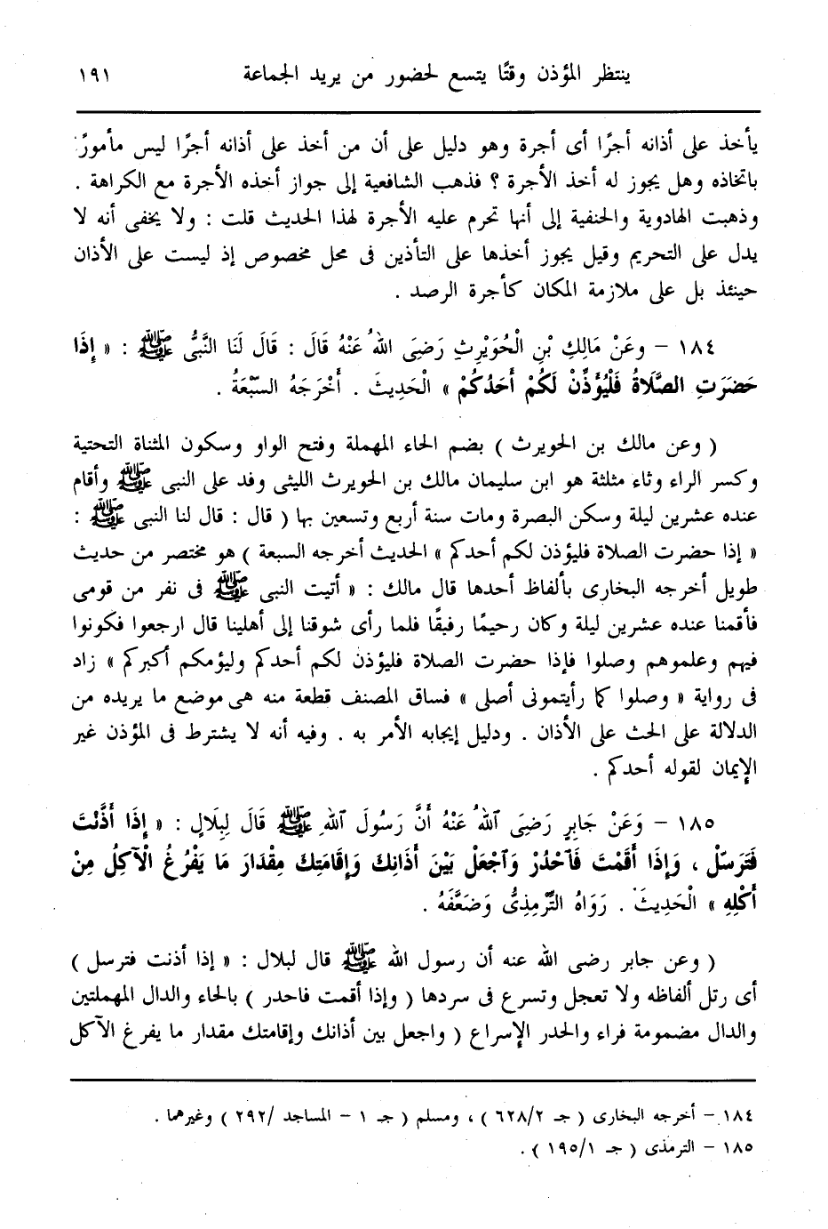 (184) - وَعَنْ مَالِكِ بْنِ الْحُوَيْرِثِ - رَضِيَ اللَّهُ عَنْهُ - قَالَ: قَالَ لَنَا النَّبِيُّ - صَلَّى اللَّهُ عَلَيْهِ وَسَلَّمَ - «إذَا حَضَرَتْ الصَّلَاةُ فَلْيُؤَذِّنْ لَكُمْ أَحَدُكُمْ» الْحَدِيثَ. أَخْرَجَهُ السَّبْعَةُ.