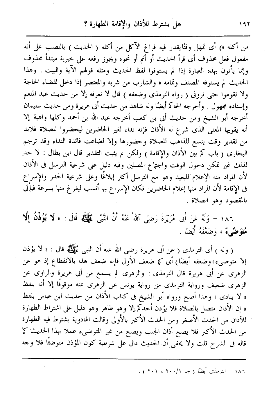 (186) - وَلَهُ عَنْ أَبِي هُرَيْرَةَ - رَضِيَ اللَّهُ عَنْهُ - أَنَّ النَّبِيَّ - صَلَّى اللَّهُ عَلَيْهِ وَسَلَّمَ - قَالَ: «لَا يُؤَذِّنُ إلَّا مُتَوَضِّئٌ» وَضَعَّفَهُ أَيْضًا