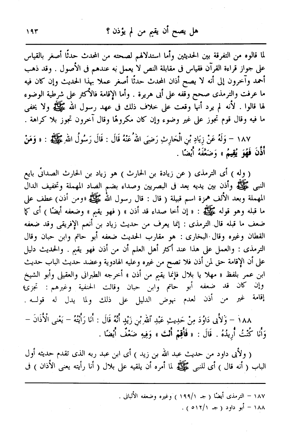 (187) - وَلَهُ عَنْ زِيَادِ بْنِ الْحَارِثِ - رَضِيَ اللَّهُ عَنْهُ - قَالَ: قَالَ رَسُولُ اللَّهِ - صَلَّى اللَّهُ عَلَيْهِ وَسَلَّمَ - «وَمَنْ أَذَّنَ فَهُوَ يُقِيمُ» وَضَعَّفَهُ أَيْضًا