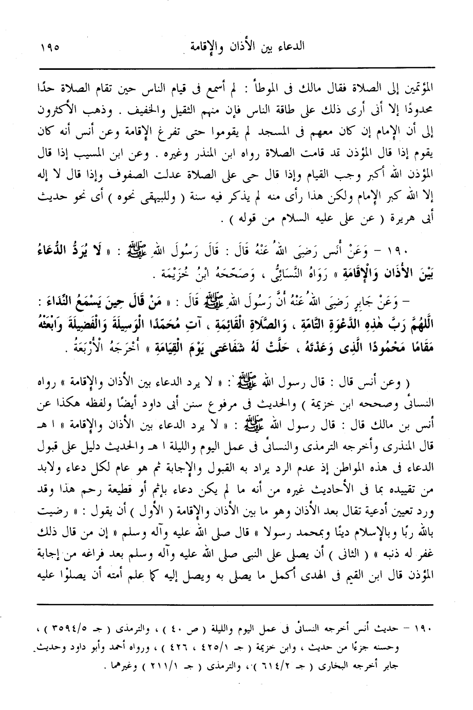(190) - وَعَنْ أَنَسٍ - رَضِيَ اللَّهُ عَنْهُ - قَالَ: قَالَ رَسُولُ اللَّهِ - صَلَّى اللَّهُ عَلَيْهِ وَسَلَّمَ - «لَا يُرَدُّ الدُّعَاءُ بَيْنَ الْأَذَانِ وَالْإِقَامَةِ» رَوَاهُ النَّسَائِيّ، وَصَحَّحَهُ ابْنُ خُزَيْمَةَ