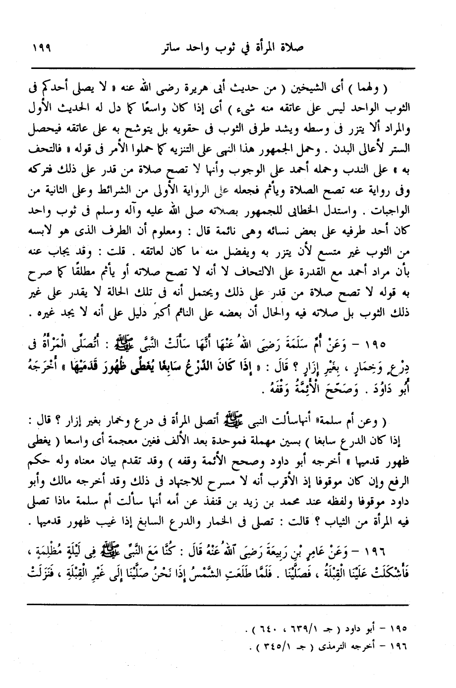 (195) - وَعَنْ أُمِّ سَلَمَةَ - رَضِيَ اللَّهُ عَنْهَا - «أَنَّهَا سَأَلَتْ النَّبِيَّ - صَلَّى اللَّهُ عَلَيْهِ وَسَلَّمَ - أَتُصَلِّي الْمَرْأَةُ فِي دِرْعٍ وَخِمَارٍ، بِغَيْرِ إزَارٍ؟ قَالَ: إذَا كَانَ الدِّرْعُ سَابِغًا يُغَطِّي ظُهُورَ قَدَمَيْهَا» أَخْرَجَهُ أَبُو دَاوُد. وَصَحَّحَ الْأَئِمَّةُ وَقْفَهُ.