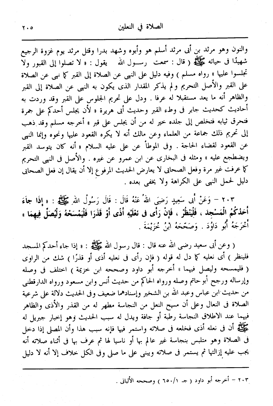 (203) - وَعَنْ أَبِي سَعِيدٍ - رَضِيَ اللَّهُ عَنْهُ - قَالَ: قَالَ رَسُولُ اللَّهِ - صَلَّى اللَّهُ عَلَيْهِ وَسَلَّمَ - «إذَا جَاءَ أَحَدُكُمْ الْمَسْجِدَ، فَلْيَنْظُرْ، فَإِنْ رَأَى فِي نَعْلَيْهِ أَذًى أَوْ قَذَرًا فَلْيَمْسَحْهُ وَلْيُصَلِّ فِيهِمَا» أَخْرَجَهُ أَبُو دَاوُد. وَصَحَّحَهُ ابْنُ خُزَيْمَةَ